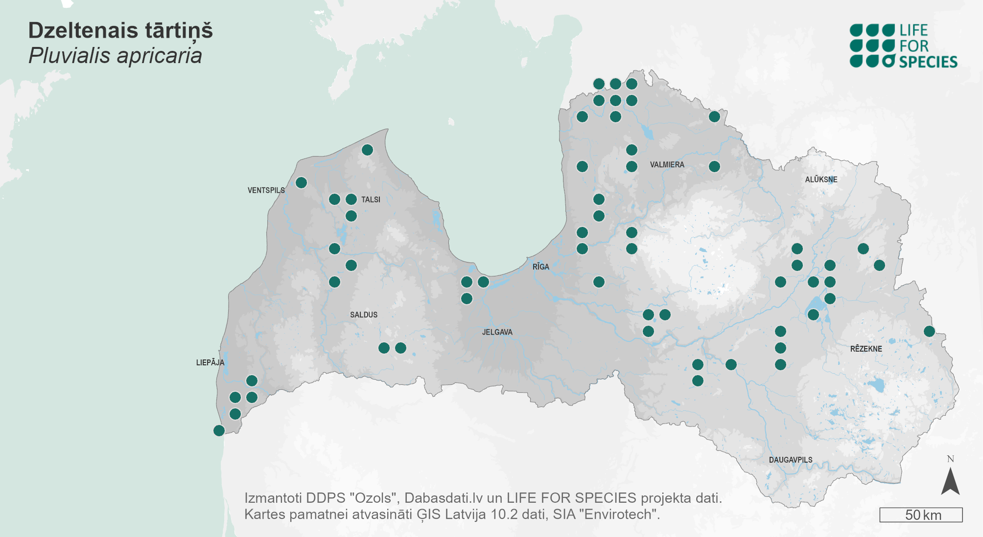 Summary. Eurasian Golden Plover − Pluvialis apricaria. In Latvia, the distribution declined considerably between 1980–1984 and 2000–2004, but remained stable between 2000–2004 and 2013–2017. The AOO of the breeding population is 456 km2, the EOO – 57,347 km2. The breeding population is estimated at 260–550 pairs (520–1,100 adult individuals). The breeding population is stable in the long term as well as the short term. In Latvia, it breeds in open raised bogs. In Latvia, threats have not been studied, but it is likely that the most important threats could be the gradual degradation of wetland habitats (overgrowth of open spaces with trees) due to drainage and recreational disturbance during the breeding season. The legal status of protected species needs to be maintained in Latvia. The conservation of raised bogs, including the prevention of the impacts of drainage, is required for the protection of the species. Disturbances should be prevented during the breeding period.