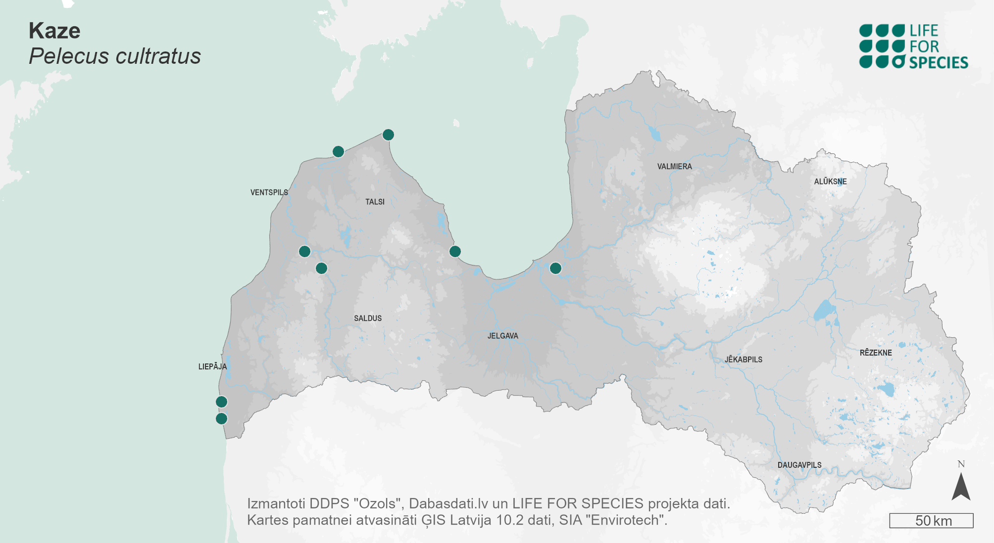 Summary. Sichel – Pelecus cultratus. Found in freshwater systems and along the coasts of the Black, Caspian and Aral Sea basins, the Baltic Sea basin from the Vistula to the Neva, in Lake Ladoga and Lake Onega, as well as in Finland and Sweden. To the west, the distribution extends to Austria. A rather rare migratory fish in Latvian territorial waters. Various literature sources mention the species as occurring in seven coastal lakes and Lake Lielais Nabas. The species has not been detected in scientific surveys in inland waters, but in 2006 several specimens were caught in commercial fisheries in Lakes Juglas and Ķīšezers. A few individuals have occasionally been recorded in scientific surveys in the Gulf of Riga and along the open sea coast. The largest number of individuals of this species was caught near Jūrmalciems in 2002. The EOO is 16,352 km2, and the AOO – 48 km2. There is insufficient data on the regional population size and fluctuations. It is an anadromous species, but there are also resident subpopulations. It inhabits the open water part of large rivers and lakes or lagoons. There are no known significant regional or global threats to the species. Threats have not been studied in Latvia. Catches of sichel in angling and bycatch in fisheries are insignificant (few specimens). As there is currently insufficient information to assess the extinction risk of the species in Latvia – there is a lack of data on its occurrence in inland waters, insufficient data on regional population size and fluctuations – the species has been assigned the category Data Deficient (DD). It is a species of EU importance and a protected species of restricted use in Latvia. It is found in three marine protected areas – “Rīgas līča rietumu piekraste”, “Irbes šaurums”, “Nida-Pērkone”; and in the «Ventas ieleja» Nature Reserve. Targeted studies on the regional population size, distribution and trends are needed, using both traditional fish survey methods and environmental DNA methods.