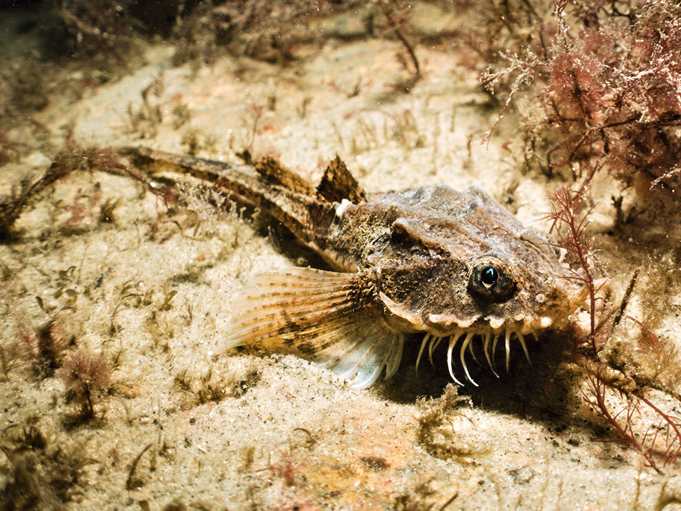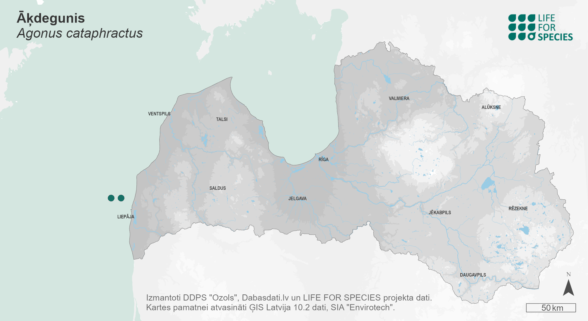 Summary. Hooknose – Agonus cataphractus. Found along the coasts of the White and Barents Seas, the Atlantic Ocean and its adjacent seas – the Norwegian, North and Baltic Seas. In the Baltic Sea, it is more abundant in the southeastern part. The species is very rare in Latvian territorial waters, and the only records from scientific surveys are from the southern part of the open Baltic Sea. The EOO in the Latvian territorial waters, according to the IUCN methodology, is currently not determinable due to the small number of sites and their distribution, while the AOO is 8 km2. The species is assessed as Least Concern (LC) at both the European and Baltic Sea levels. No studies have been carried out in Latvia to assess the regional population. It is a benthic marine fish inhabiting both sandy and muddy coastal seabeds at depths of 20–70 m. The species is euryhaline – it inhabits habitats with a wide range of salinity. The species has no economic importance. As a coastal species, it can be threatened by the degradation of shallow water habitats due to various types of coastal development (e.g. construction and maintenance of wind farms and ports). These threats may also include degradation of water quality through eutrophication and chemical pollution. Due to the overall lack of information to make an assessment of the extinction risk – the EOO of the species has not been determined, the regional population size and changes are unknown – the species has been assigned the category Data Deficient (DD). The species is not on the lists of international agreements, species of EU importance and Latvian lists of protected species. Specialised species detection targeted monitoring, including environmental DNA analysis, is needed to assess the distribution of the species. Studies on the regional population size, habitat extent and changes are also needed.