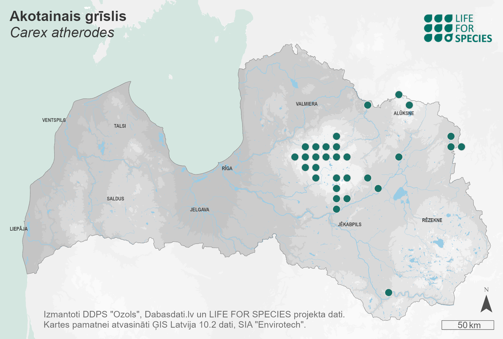 Summary. Wheat sedge – Carex atherodes. Rather rare in Latvia, occurring only in the eastern part of the country, mostly in the Vidzeme Upland. The EOO is 15,712 km2, and the AOO – 200 km2. The species may be more widespread within the known distribution area than currently known. The categories from LC to EN are equally possible, therefore the species has been assessed as NT. The population is severely fragmented. Data on population size and dynamics are unknown. Some records indicate that a single subpopulation can occupy even several hectares. C. atherodes grows in wet grasslands, openings and clearings of swamp woodlands, on the lakeshores and riverbanks. The species is mainly affected by drainage and land use change. However, it seems that C. atherodes sometimes benefits from grassland abandonment and outcompetes other species. The increasingly dry and hot summers may threaten the species in the long term. Most of the known subpopulations are outside the protected areas. It occurs in the “Veclaicene” Protected Landscape Area, the “Vesetas palienes purvs” and “Mugurves pļavas” Nature Reserves, and the “Kuja” Nature Park. One microreserve has been established. A species inventory and a population assessment are required. Species reproduction type should be checked as in some countries vegetative reproduction prevails and seed production is rare. The most significant species occurrences should be identified and protected. Drainage in the species’ habitats should not be permitted.