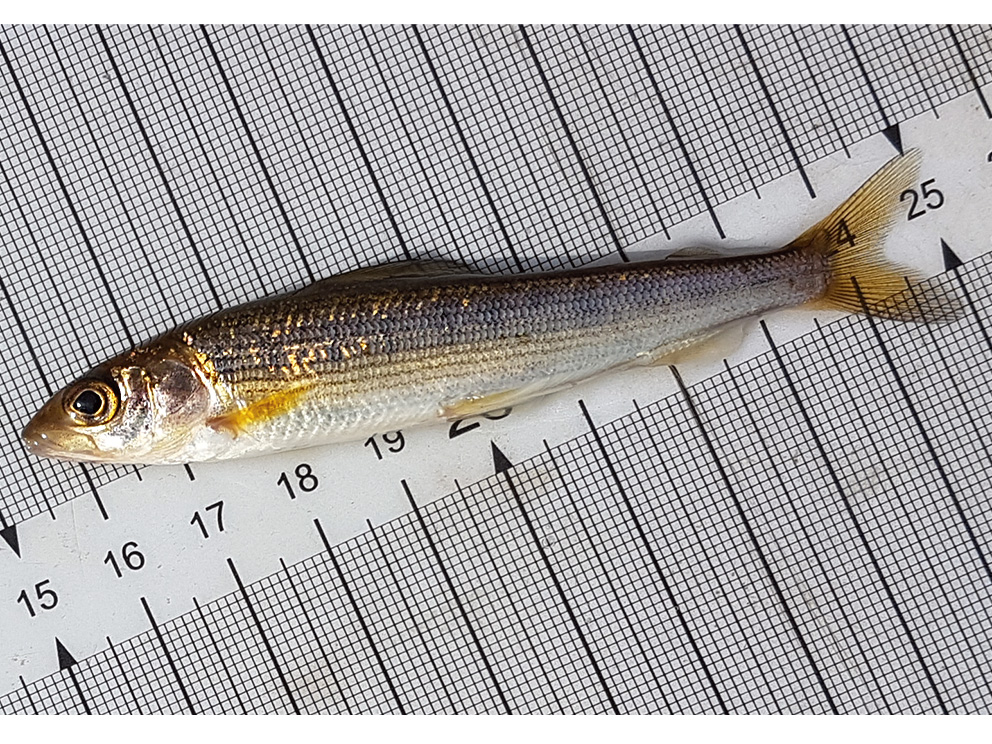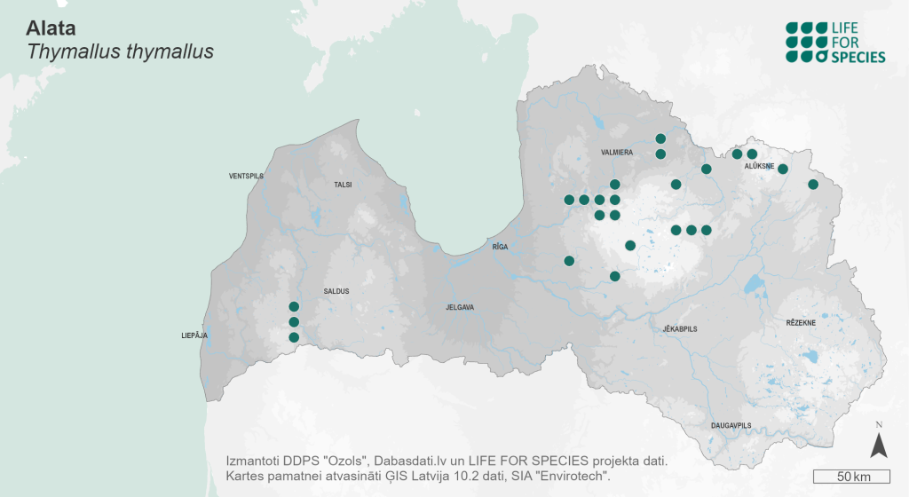 Summary. Grayling – Thymallus thymallus. Found in the Barents Sea basin west of the Urals, the Caspian, Black, Baltic, White and North Sea basins (including the British Isles), the Loire and Rhone river basins in France and the river basins in the northern Adriatic Sea catchment. It is rare in Latvian rivers, mainly found in tributaries of the Venta and Gauja rivers, and has also been recorded in the Velikaya river basin. During the scientific surveys in the period between 1993 and 2022, it was found in 22 rivers, with known catches in another 13 rivers. The EOO is 14,963 km2, and the AOO – 164 km2, but the actual distribution may be larger. In Europe, the population size and trends have not been assessed, but the species is widespread. The localities in Latvian rivers are in small number and fragmented, probably due to the specific ecological requirements of the species. Therefore, the species is assessed as Near Threatened (NT). Long-term monitoring in some rivers inhabited by the species, such as the Amata, Lētīža and Līgatne, does not indicate a continuous decline in abundance or severe fluctuations in the number of individuals. It inhabits cold, oxygen-rich waters, mainly rapid river sections with hard sand or rocky substrates. At a regional scale, the species is affected by river pollution, damming and changes in the hydrological regime. As a coldwater species in the southern part of its range, it is increasingly exposed to the negative effects of climate change. 66% of the known localities are located in the protected nature areas – the Gauja National Park, the “Rauza”, “Ventas un Šķerveļa ieleja” Nature Reserves, the “Ogres ieleja” Nature Park, and the “Ziemeļgauja” and “Veclaicene” Protected Landscape Areas. A species of EU importance and protected in Latvia, for which micro-reserves may be established to protect spawning grounds and for which harvest restrictions have been established. The legal status of the species should be maintained. In order to protect the regional population, it is necessary to prevent illegal catches and the impact of hydropower plants on the hydrological regime of rivers. Targeted monitoring using both traditional and environmental DNA methods is needed to clarify the presence of the species in Latvian inland waters.