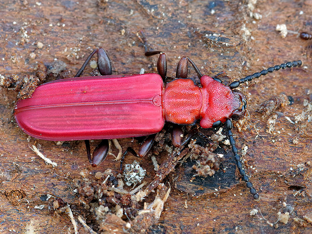 Summary. Flat bark beetle – Cucujus haematodes. The species is widely distributed throughout Eurasia from the central and eastern parts of Europe to the Russian Far East and Japan. Latvia is located in the north-western part of the distribution range. The EOO is 20,202 km2, and the AOO is 108 km2. The population is fragmented throughout the range and is declining in Europe. The state and trends of the Latvian regional population are unknown, but it has been concluded that both the AOO and the population of the species are declining. It is mainly found in old- growth and natural coniferous forests, and also inhabits old and natural mixed forests. Larvae develop under the bark of decaying trees, mostly in snags, rarer in fallen trunks. The main threats are the decline of old-growth boreal forests and the general decline of decaying wood in forests. Therefore, it is necessary to preserve old forest stands and ensure the long-term availability of decaying wood. Further studies of ecology, distribution and population trends are required. The species is assessed as Endangered (EN) due to the small EOO and AOO and the continuous decline of both the AOO and regional population. It is not a species of EU importance and is not protected in Latvia. It is proposed to include C. haematodes on the list of protected species of Latvia for which micro-reserves can be established. About 90% of known localities are in micro-reserves established for the conservation of capercaillie.
