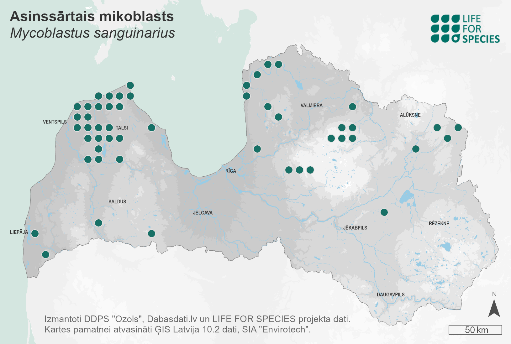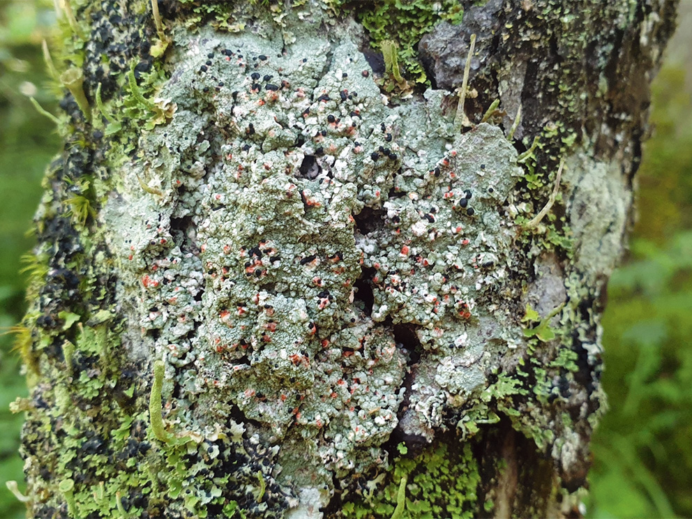 Summary. Mycoblastus sanguinarius is distributed in the Northern Hemisphere. Approximately 146 localities are known in Latvia (the number of registered observations exceeds 800). The EOO is 47,968 km2, and the AOO is 584 km2. An epiphytic species, though less often epixylic or epigeic. It grows on the bark of black alder, bog birch, pine bark and branches of spruce. It is less frequently found on sandstone outcrops, dead coniferous wood, junipers, and the bark of white alder. The species is found in old forests with stable and increased air humidity. The species is threatened by logging in old wet forests, which reduces the number of suitable trees, as well as by other activities that alter the hydrological regime and microclimate of these forests. It is assessed as Near Threatened (NT) because a decrease in the area of suitable habitats is expected in the future. This is a protected species in Latvia, for the preservation of which micro-reserves can be created. Its legal status of protection must be maintained. More than half of the observations were made in protected areas, for example, there were numerous observations in the “Ances purvi un meži” and “Ziemeļu purvi” Nature Reserves and the Slītere National Park. Old wet forests should be protected, preventing logging and changes in the natural hydrological regime.