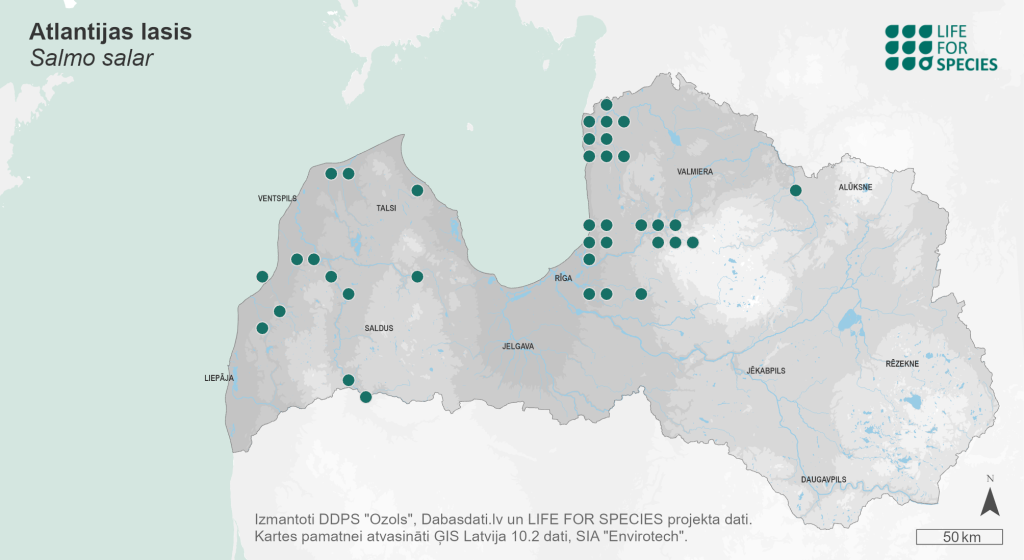 Summary. Atlantic salmon – Salmo salar. The natural range of the species extends from the river basins of the North Atlantic and Baltic Sea to the Iberian Peninsula. It is also found in the western Atlantic. In Latvia, it is found in 37 rivers, but wild salmon spawning regularly occurs in 13 rivers. The EOO is 34,556 km2, and the AOO is 488 km2. In Latvian salmon rivers, the overall stock status remains insufficient to support a sustainable regional population and is characterised by large annual fluctuations; smolt production is consistently below the target of at least 75% of its potential. In the River Salaca, the most productive wild salmon river in Latvia, there have only been four productive generations (at least 75% of the smolt production potential) since 2005. In other salmon rivers, smolt production is less than 5% of potential in most years. Despite fishing regulation and intensive supplementary releases of reared salmon in mixed salmon rivers, the overall status of the regional population has not improved, probably due to continuous habitat degradation in rivers (overgrowth, sediment accumulation) and possibly also due to poorer feeding success at sea. Habitat mapping data show that the decline in habitat quality at the national level is continuous and exceeds 30% over three generations (15 years). The species is therefore assessed as Vulnerable (VU). It is an anadromous, pelagic, coldwater fish species, spawning and juvenile development take place in the rapid sections of rivers, while the main feeding, growth and maturation take place in the sea. Spawning occurs in rivers where water temperatures exceed 10 °C for at least three months of the year, but do not exceed 20 °C for more than a few weeks in summer. Salmon is a species of EU importance and protected species in Latvia, for which micro-reserves can be established to protect spawning grounds and for which harvest restrictions have been established in Latvian waters. The main way to improve the status of salmon is to increase the area of habitats suitable for spawning and juvenile development and to increase their accessibility for migration from the sea. The status of the regional salmon population can also be improved by eliminating illegal catches.