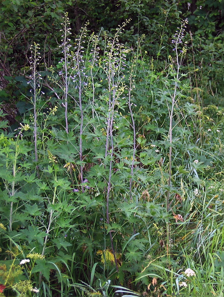 Morfoloģija un bioloģija. Daudzgadīgs 0,8–2 m augsts lakstaugs. Stublāji stāvi, vienkārši vai nedaudz zaroti, apakšdaļā parasti īsi apmatoti. Apakšējās stublāja lapas ar garu kātu, uz stublāja pamīšus, plātne 6–15 cm gara, 4–10 cm plata, staraini šķelta vai dalīta 3–5 daivās. Ziedkopa – līdz 50 cm garš, blīvs ķekars stublāja un zaru galos. Ziedi 2–5 cm gari, zili vai bālzili. Apziednis vienkāršs, vainaglapveida, apziedņa lapas piecas, no tām četras apakšējās olveidīgas, bet augšējā apziedņa lapa veido garu piesi. Auglis – someņu kopauglis, kas parasti salikts no trim someņiem. Zied jūlijā un augustā (Tutin, Chater 1993; Tabaka 2003).