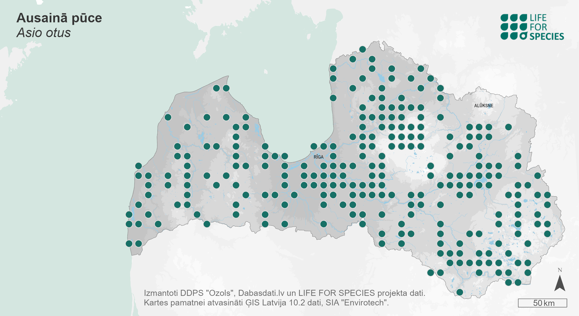 Summary. Long-eared Owl − Asio otus. In Latvia, the distribution has not changed significantly since the 1980s, but the differences in information, surveying methods and technical support are likely to have played an important role. The AOO of the breeding population is 1,664 km2, and the EOO – 78,183 km2. The breeding population is estimated at 3,766–12,362 pairs (7,532–24,724 adult individuals). The population is fluctuating in the long term, while the short-term trend of the population is unclear. Calculation of the magnitude of population changes with the use of long-term data allows to conclude that a population decline of more than 50% has occurred over three generations. A wide open landscape dominated by grasslands is important as foraging sites. The abundance of parks, cemeteries with trees, avenues, small forest clusters and woodland edges is important for breeding. The most important places are those where the age of the stand exceeds the final felling age. The species is threatened by intensive farming – pesticide use and ploughing – which destroys the food base. The species is sensitive to disturbance during the egg-laying period. Breeding success is negatively affected by the disruption of rodent population cycles (cyclical fluctuations in population size), with populations remaining at low levels. Nests are destroyed by felling trees during the breeding season. Individuals die on the roads. Monitoring of the breeding population is ongoing. The species must be included on the list of protected species of Latvia. To protect the species, a species conservation plan must be implemented, which includes the conservation and management of grasslands to increase the number of mammals, preservation of forest edges, cessation of logging and maintenance clearing of young stands from 1 April to 30 June, increasing the number of ecological trees to be left, and continued monitoring of the species, which must be supplemented with the monitoring of breeding success, and the monitoring of small mammals must be resumed.