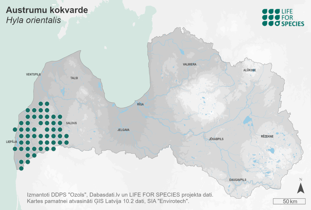 Summary. Eastern tree frog – Hyla orientalis. The species belongs to the Hyla arborea complex, which is mainly found in central and southern Europe. In Latvia, it occurs only in the Kurzeme region. According to the distribution data for 2002–2021, the AOO is 604 km2, and the EOO – 4,916 km2. The regional population is the result of the reintroduction of individuals captured in Belarus. The regional population, based on monitoring data for 2016–2018, is estimated to comprise at least 80,000 adults. It is assumed that the population is still increasing and has not yet colonised all suitable habitats at the periphery of its range. The species is mainly found in open and semi-open habitats, but less frequently at the edge of forests. It also occurs in small natural and semi- natural habitats in agricultural landscapes, including tree and shrub patches near farmsteads and in orchards. The presence of wetlands is important, where the species breeds in terrain depressions and beaver ponds. The population is isolated from the rest of the species’ range and there is still a risk of rapid population decline in the future, as 75% of individuals are found in agricultural landscapes with a high risk of agricultural intensification (fertilisation, eutrophication, pesticides, drainage), which can lead to rapid declines. Additional risks are the lack of conservation measures and the fact that the species occur mainly outside protected nature areas. There is still a risk of extinction within the next 100 years. It is assessed as Near Threatened (NT) as a formerly extinct, now reintroduced species with a small distribution in Latvia, equivalent in area to the Vulnerable (VU) category, and a population isolated from the rest of the species’ range, characterised by rapid turnover of individuals within subpopulations. It is a species of EU importance and protected species in Latvia. It is proposed to be included on the list of species for which micro-reserves may be established. The development of a species conservation plan and conservation measures in all protected nature areas within the species’ range is necessary for the sustainability of the regional population. Identification, protection and maintenance of key breeding sites are potential conservation measures.