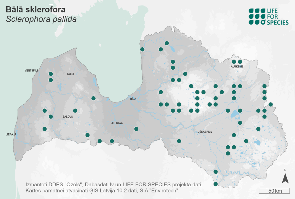 Summary. Sclerophora pallida is found in North America and Eurasia. More than 80 localities are known in Latvia. The EOO is 57,977 km2, and the AOO is 312 km2. This epiphytic species is mainly associated with park-like habitats, such as parks, alleys, wooded meadows, as well as separately growing old trees and various forest habitats with broadleaves. It mainly grows on the bark of deciduous trees (more often ash, oak, elm and maple), but less often on dead deciduous wood. The main threats are related to the felling of old broadleaf trees and their overgrowth in shrubs in habitats suitable for the species. It is assessed as Vulnerable (VU) because the number of mature individuals does not exceed 1,000. The species is protected in Latvia, and micro-reserves can be created for the preservation of its habitats. The need to create micro-reserves can be reviewed. Most of the sites are in protected areas, for example, in the “Lubāna mitrājs” and “Mugurves pļavas” Nature Reserves, and in protected alleys. Old broadleaves should be preserved in park-like habitats, alleys and forests; in the park-like habitats, reducing shading around trees inhabited by the species may be necessary.