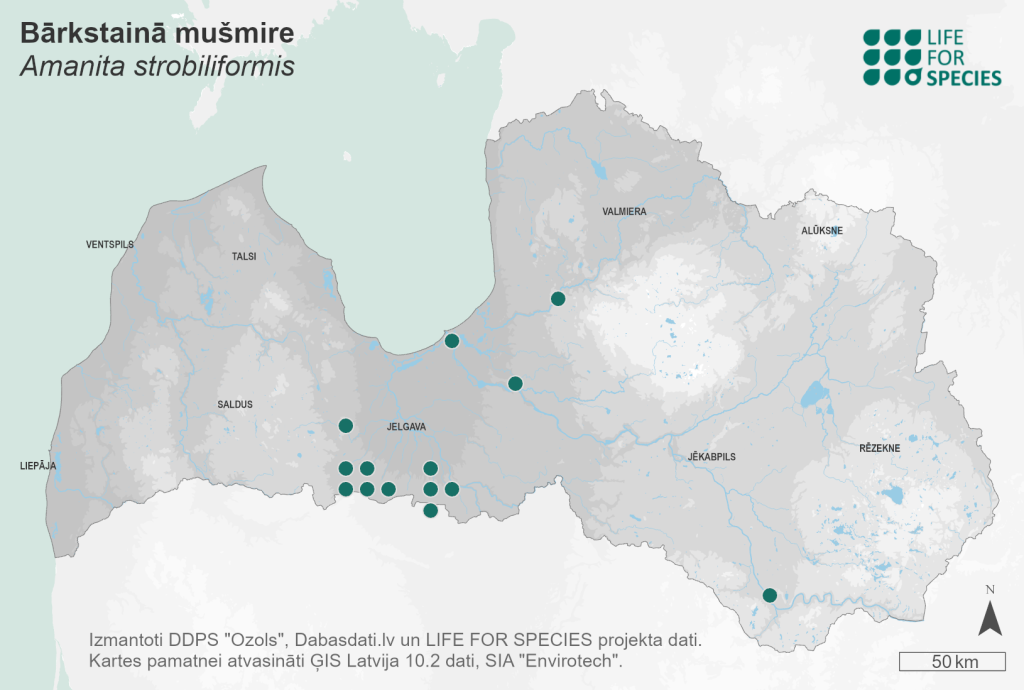 Summary. Warted amanita – Amanita strobiliformis. Found mainly in Europe and North America, and locally in Asia, Africa, South America, and Australia. It is rare in Latvia; located in 25 areas by 2022. The EOO is 8,582 km2, and the AOO – 100 km2. There’s no information available on changes in distribution due to a lack of studies. Although there is a general lack of data on the regional population size and changes, it is considered as stable in the Zemgale region. The number of mature individuals in Latvia probably does not exceed 1,000. It is mycorrhizal with deciduous trees. In Europe, it occurs in sunny, open areas in broadleaved forests, wooded meadows, parks, forest edges, open areas, and on calcareous soils. In Latvia, it is found mainly in man-made habitats such as parks and alleys, and very rarely in natural habitats. In parks, it is threatened by inappropriate management, e.g. destruction of young fruiting bodies by mowing or trampling, thus preventing the spread of spores. It is assessed as Endangered (EN) due to its low AOO, which is expected to decline, and the expected reduction in the size and quality of suitable habitats. It is a protected species in Latvia. The legal status of the species in Latvia must be maintained. All localities are outside protected nature areas. For the conservation of the species in parks and alleys, the destruction of young fruiting bodies must not be allowed. Research on the regional population size, distribution in natural habitats, life cycle and ecology is needed.