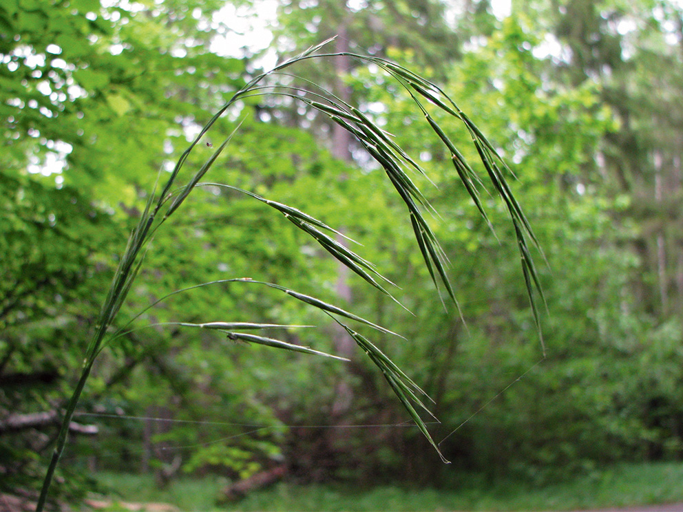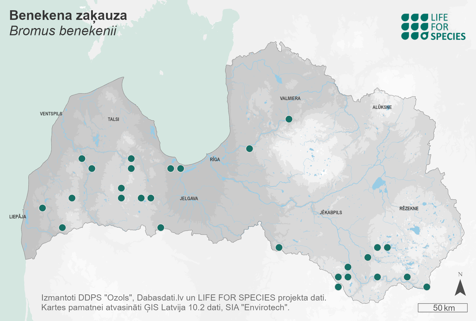 Summary. Lesser hairy-brome – Bromus benekenii. In Latvia, it is a rare species with an uneven distribution, found mainly in western and south-eastern Latvia. The AOO is 168 km2, and the EOO – 35,484 km2. The population size and its dynamics are unknown, but the species may be more common than is currently known. Over the past 30 years, the AOO and the EOO have increased slightly, which can be explained by more intensive research. The AOO may be slightly larger, considering the presence of suitable habitats. B. benekenii grows in old, fertile natural deciduous and mixed forests and forests on slopes and ravines. It is a specialist species in old-growth forests and is characteristic of forests with uninterrupted continuity. More than 65% of the species’ localities have been found in protected areas, e.g., in the “Pilskalnes Siguldiņa” and “Jašas-Bicānu ezers” Nature Reserves. The species is threatened by the felling and fragmentation of old-growth deciduous and mixed forests. Studies of the distribution and population size of the species are necessary. Microreserves should be established to preserve the richest newly discovered localities of B. benekenii. Logging should not be permitted in the species’ localities.