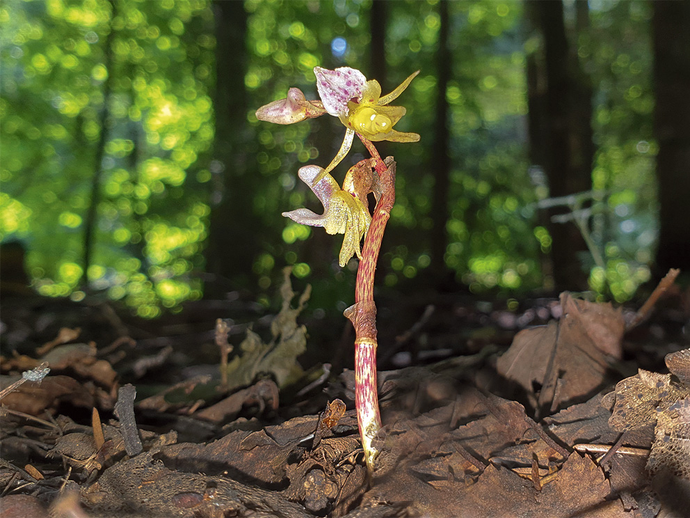 Summary. Ghost orchid – Epipogium aphyllum. It is very rare in Latvia. It is mainly found in damp, shady deciduous, mixed and spruce forests in eastern Latvia. Fifteen recently recorded localities are known. The AOO is 32 km2, and the EOO – 18,623 km2. The threats are intensive forestry in old-growth and natural forests and their transformation into tree monocultures and forest drainage. The size of the known population is approximately 50–75 mature individuals. The species is on the list of protected species of Latvia. The largest percentage of the species’ localities occur outside the protected areas. This species is recorded in the “Vecumu meži” and “Kupravas liepu audze” Nature Reserves. New microreserves must be designated and the existing protected areas with appropriate regimes must be enlarged to ensure the conservation of this species and its habitats. A targeted species inventory is necessary. Clearcutting and drainage should not be permitted in the E. aphyllum localities.