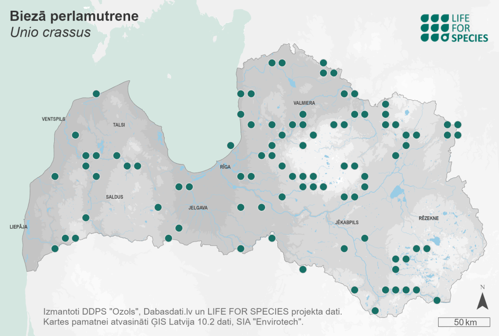 Summary. Thick shelled river mussel – Unio crassus. The natural range is western Palearctic, excluding the far north and south. Latvia is situated in the northern part of the range. The EOO is 71,796 km2, and the AOO is 660 km2, but the AOO could be up to two times larger, considering the area of suitable habitats and localities that have not been surveyed in the past 20 years. The population has been declining in abundance and density throughout its range in recent decades and is one of the most threatened mussel species in Europe. Targeted research on the species in Latvia has been carried out mainly in protected nature areas. Although the species mainly inhabits rivers with high and good ecological quality, in some cases it has been found in localities with relatively high eutrophication; the occurrence of individuals in such localities is low (Rudzīte u. c. 2010). The species is found in fast-flowing rivers with sand, gravel, pebbles or rocks and and a small layer of silt or detritus. Some localities are also in artificial watercourses, e.g. the Kauguri canal. The habitat and water quality of the species are expected to deteriorate due to eutrophication. It has been reported that bivalve glochidia die when nitrate concentrations in the water exceed 2 mg/l (Köhler 2006; Zettler, Jueg 2007). Some subpopulations in small rivers may be affected by beaver activity (Rudzīte u. c. 2010). Subpopulations downstream of small hydroelectric plants are particularly negatively affected during dry summers, as the water flow needed for the river’s functioning is not ensured. It is assessed as Vulnerable (VU) based on past and projected future regional population declines and threats to the species. The species is included in the 2nd edition of the Red Data Book of Latvia (Parele 1998), on the list of species of EU importance and Latvian protected species for which protection micro-reserves can be established. The legal status of the species must be maintained. Approximately 80% of the known localities are in protected nature areas e.g. in the “Kuja” Nature Park, the “Mežole” Nature Reserve, etc. Habitat protection is required by limiting water level fluctuations caused by hydroelectric power plants, buffer zones between farmland and rivers, etc. Further research on the regional population size, distribution and trends of the species, as well as the status of the habitats, is recommended.