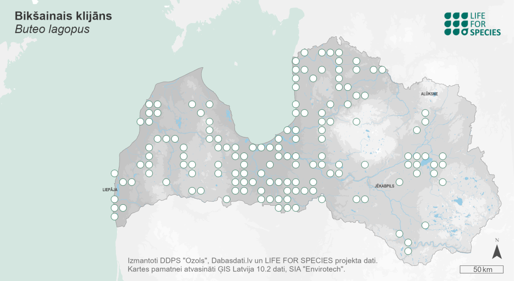 Summary. Rough-legged Buzzard − Buteo lagopus. The AOO of wintering population in Latvia is 844 km2, the EOO – 64,587 km2. The size of the wintering population is unknown, but it is suspected to be less than 250 individuals. The population trends are unknown. In Latvia, it occurs in a variety of cultural landscapes, wetlands, etc. In some places, illegal killing of the species can be a problem. The species suffers from collisions with road vehicles and power lines. The species may also be threatened by climate change. The legal status of protected species does not need to be changed in Latvia.