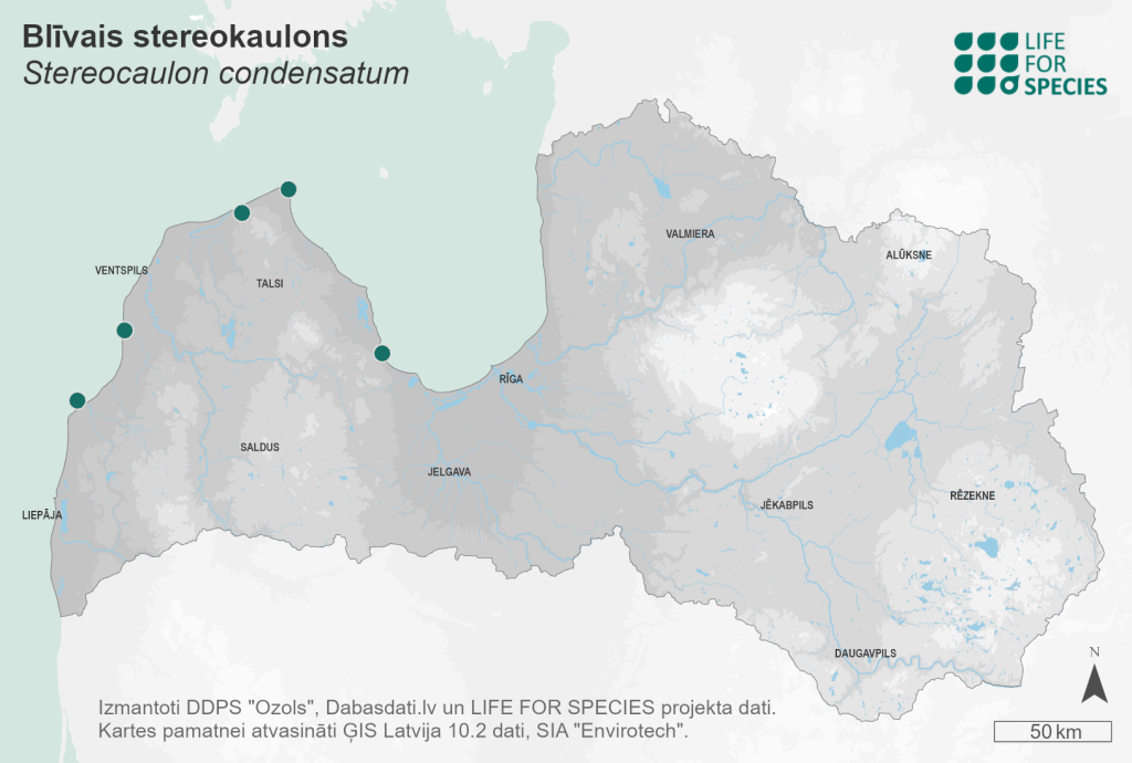 Summary. Stereocaulon condensatum occurs in Europe, western Asia and North America. Five localities have been identified in Kurzeme Region of Latvia. The EOO is 5,584 km2, and the AOO is 20 km2. An epigeic species. In Latvia, the species is found on sandy soils or on stones in places where the soil is sandy. It is more common in open habitats and in sparse old pine forests and forest edges. Soil erosion and habitat overgrowth are the main threats to the survival of the species. Assessed as an Endangered (EN) species because the number of mature individuals does not exceed 250, the species has a low number of locations and small AOO, and a decline in habitat quality is expected. It is a protected species, and the legal conservation status of the species must be maintained. Several known localities of the species are situated in protected areas – “Užava” Nature Reserve and Slītere National Park. Habitats occupied by the species require moderate management or disturbance to keep them open and to create open sandy areas.