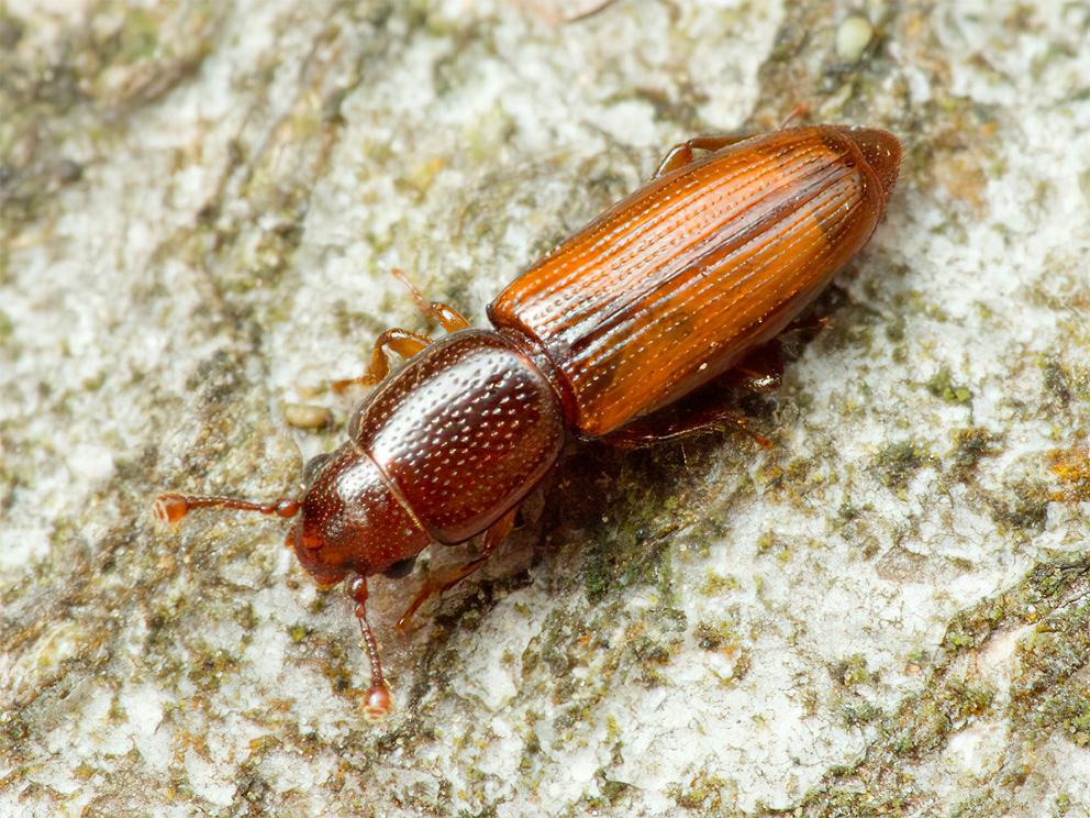 Summary. Root-eating beetle – Rhizophagus brancsiki. The species is distributed from western Europe to the Caucasus and eastern Europe (Russia) and from Latvia and southern Sweden to the Balkans (Jelínek 2007; Telnov et al. 2011, 2016). The Latvian regional population is located at the northern extent of the distribution range and is isolated from the regional populations in neighbouring countries. Three localities of this species are currently known in Latvia (Telnov et al. 2011, 2016); another previously known locality has been lost due to the clearcut. The EOO is 126 km2, but the potential EOO likely corresponds with the entire land area of the country. The AOO is 12 km2, but the potential AOO is likely to be significantly higher. Only a few adults have been observed, and studies on the size, status and trends of the Latvian regional population have not been carried out. It is saproxylic and is bound to old mixed and deciduous forests. Larvae develop and adults dwell under bark of various decaying deciduous trees (Bourdonné et al. 2019). Threats to the Latvian regional population have not been specifically studied. The main threat in Europe is the decline in habitat quality due to logging, changes in the age structure of forest, and decline in the area of occupation. In Latvia, it is assessed as Endangered (EN) due to the small EOO and AOO, severely fragmented regional population and continuous decline in EOO, AOO, area and quality of habitat and number of localities. The species is not included in international or national regulatory acts and is not protected. There is no need to revise its current protection status in Latvia. All known localities are outside protected areas. To protect the regional population, its habitat – old-growth deciduous forests need to be preserved, and their continuity ensured. Preserving old or hollow trees is the most convenient way to protect the species at the localities where it occurs.