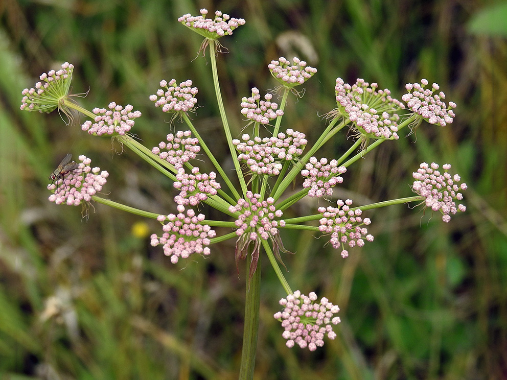 Morfoloģija un bioloģija. Daudzgadīgs 30–100 cm augsts lakstaugs. Stublājs stāvs, nedaudz zarojas, sīkrievains. Lapas cietas, nedaudz ādainas, galvenokārt stublāja lejasdaļā, lapas ass taisna, nekad nav lauzīta. Piezemes lapas ar kātu, divkārt vai trīskārt plūksnainas, 20–50 cm garas un ap 15–30 cm platas, plātnes virspuse zaļa, apakšpuse gaišāka, zaļganpelēka. Pēdējās pakāpes plūksnas lielas, iegareni olveida, plātnes mala asi nevienādi zāģzobaina. Stublāja augšējo lapu parasti nav vai tās ir sēdošas, ar reducētu plātni. Ir vīkala un vīkaliņa lapas. Ziedi sīki, nelielos čemuros stublāja un zaru galā, čemurā 15–30 stari. Vainaglapas piecas, baltas, olveidīgas, ap 1,5 mm garas, ar jomainu galu. Auglis ir eliptisks, 4–6 mm garš sēkleņu skaldauglis, katrs skaldenis ar strupām muguras ribām un spārnveidīgām malējām ribām. Zied jūlijā un augustā (Tutin 1968; Fatare 2003; Pimenov, Ostroumova 2012).