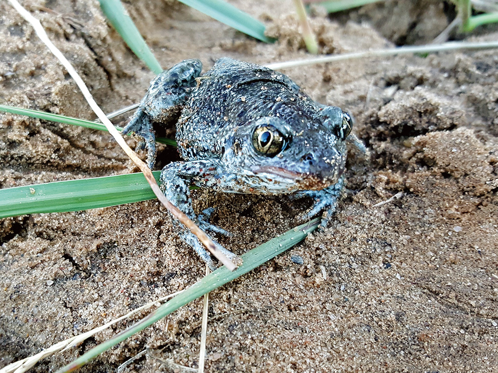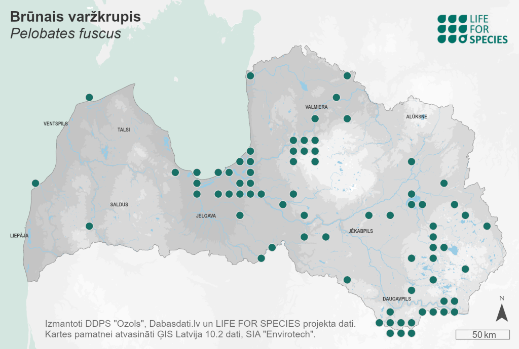 Summary. Common spadefoot toad – Pelobates fuscus. Belongs to a morphologically identical two-species complex (P. fuscus / P. vespertinus), distributed from central Europe (Germany) and southern Scandinavia (Sweden) to southern Siberia. It occurs over a wide area in Latvia, but is very rare in the Kurzeme region and in the Zemgale Plain, and absent in some regions (e.g. the Vidzeme Upland and north-eastern Latvia). The AOO is 516 km2, and the EOO – 62,658 km2. The size of the regional population is over 120,000 adults. The regional population trend is unknown, but it may be declining in south-western Latvia. The species occurs in agricultural landscapes, dunes, shrubs, forest edges; terrestrial habitat preferences have not been studied in Latvia. It occupies habitats with loose soil in which it can dig itself in. The species is threatened by intensive agriculture (nutrient inputs to breeding waters, use of pesticides), habitat conversion and degradation, construction of road and rail infrastructure and the spread of invasive species such as Perccottus glenii. The species is assessed as Near Threatened (NT) due to reductions in its range and the low number of adults in subpopulations (ranging from a few dozen to a few hundred individuals). It is listed as a species of EU importance and is protected in Latvia. It is proposed to be included on the list of species for which micro-reserves can be established. The species conservation plan has not been developed and none of the existing management plans for protected nature areas include measures to protect the species; however, the measures to improve amphibian populations foreseen in the management plans of the “Silene” and “Piejūra” Nature Parks will also contribute to the protection of P. fuscus. There is a need for population trend studies and monitoring of the species, as well as population assessments and conservation measures for those protected nature areas where this has not been done.