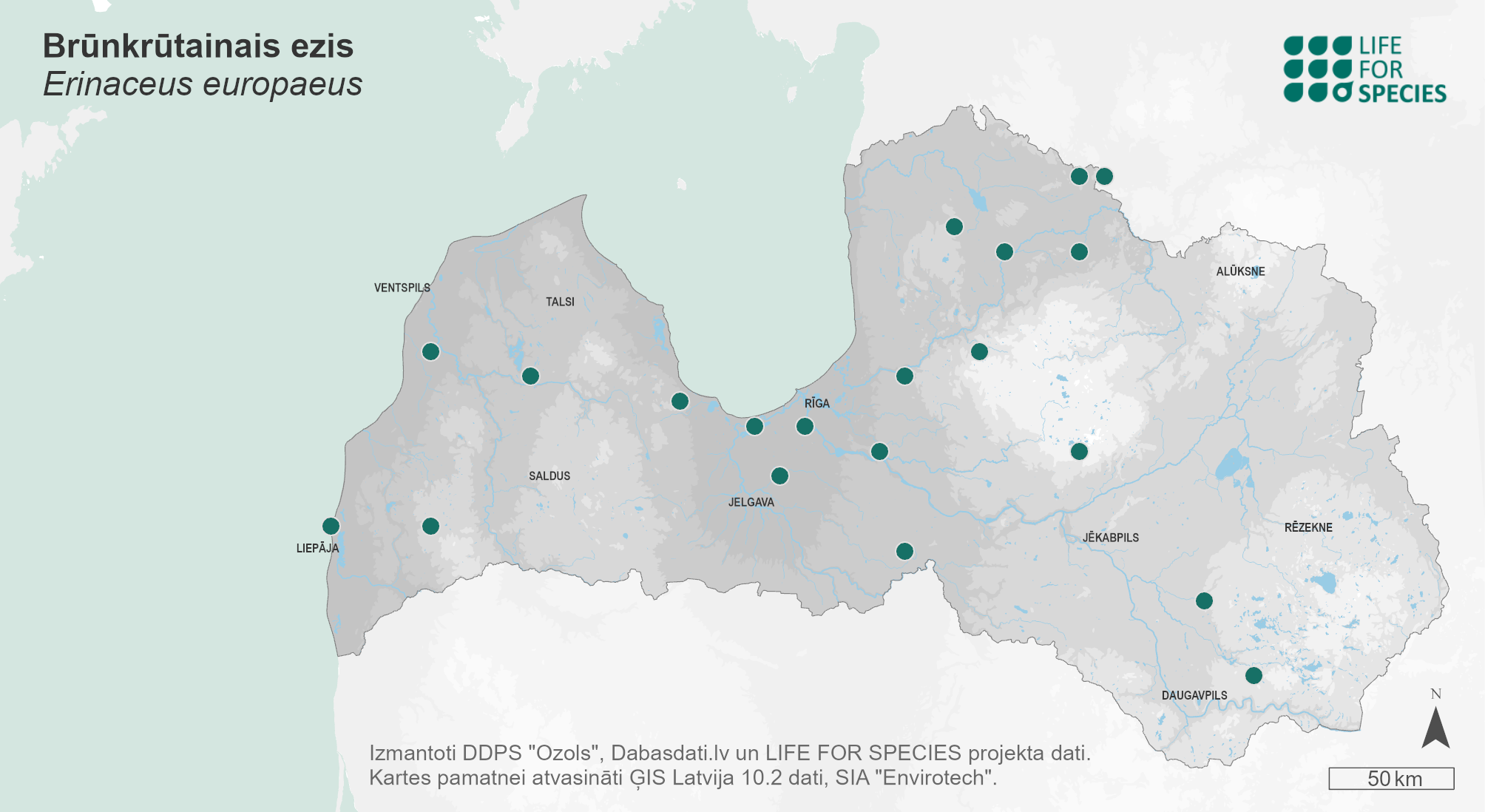 Summary. Western European hedgehog − Erinaceus europaeus. Data is lacking on both the historical and current occurrence of the species in Latvia. Firstly, this is due to changes in the systematics of the genus Erinaceus. In the second half of the 20th century, two subspecies of E. europaeus were recognised in Latvia: E. e. europaeus and E. e. roumanicus. It was regarded as a rather common species, but information on the occurrence at subspecies level is lacking. Secondly, the former subspecies and nowadays two species (E. europaeus and E. roumanicus) are difficult to distinguish visually due to the high variability in fur colour. In the 1990s, when data was collected for the European Mammal Atlas, the species was found only in the northern part of Latvia. Considering that E. roumanicus has been observed to expand its distribution from south-eastern Europe to the north-west, north DD and north-east, it is possible that E. roumanicus is outcompeting E. europaeus in Latvia. Only E. roumanicus occurs in Lithuania. Both species (mainly E. europaeus) occur in Estonia. The possible extinction due to interspecific competition is the reason for assessing E. europaeus as Data Deficient (DD). Special studies are needed to confirm or reject the hypothesis that E. europaeus is extinct in Latvia. The species is not a protected species in Latvia, and currently a legal status is not required.