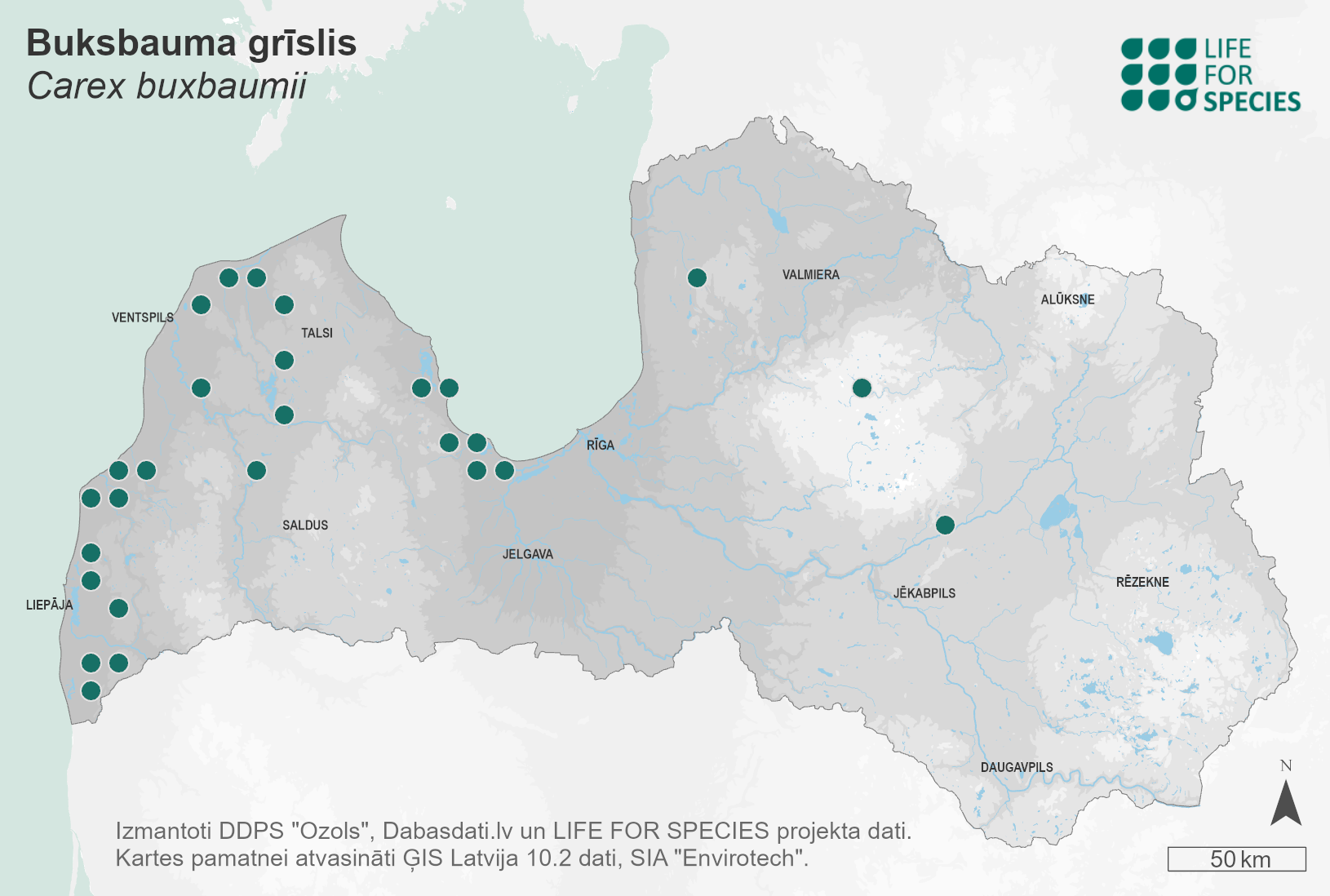 Summary. Club sedge – Carex buxbaumii. It is rare in Latvia, found mainly in western Latvia, and literature records from the south-eastern part of the country. The EOO is 31,222 km2; it has not changed significantly compared to the previously known distribution of the species in Latvia. Due to drainage and a lack of fen and grassland management, the AOO, which is currently 200 km2, has most likely decreased and is likely to continue to decline in the near future. There are no data on the size of subpopulations in each locality and the overall population dynamics in Latvia. The number of individuals in most sites is small, sometimes only a few plants have been found. The species grows in alkaline fens and wet grasslands on soils with fluctuating water tables, including Schoenus ferrugineus or Molinia caerulea communities. It grows on moist, nutrient-poor, alkaline soils. The species is threatened by the drainage of fens and forests, in some places by the cessation of fen and grassland management. Most of the localities are in protected areas. Rich subpopulations occur in the “Engures ezers” Nature Park, the Ķemeri National Park and the Grīņi Strict Nature Reserve. It is recommended to identify other places rich in individuals and ensure their conservation and management. In some places, it may be necessary to reduce the impact of drainage (to be assessed on-site when planning management).