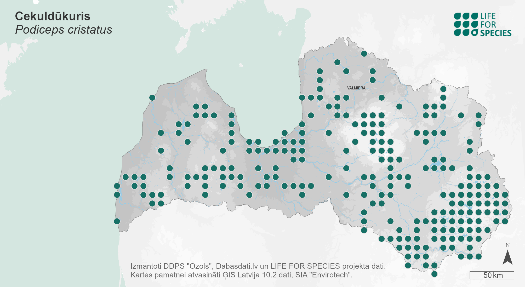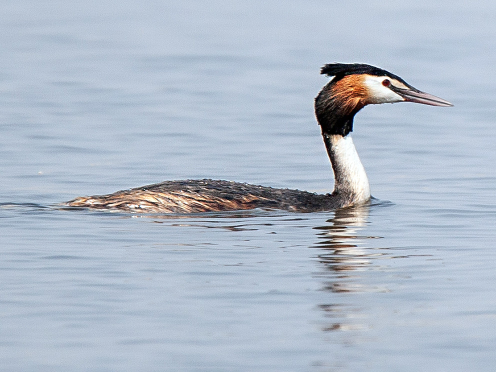 Summary. Great Crested Grebe − Podiceps cristatus. In Latvia, the distribution decreased considerably between 1980–1984 and 2000–2004 and has remained stable since then. The AOO of the breeding population is 2,256 km2, the EOO – 78,106 km2. The breeding population is estimated at 3,000–6,200 pairs (6,000–12,400 adult individuals). The long-term population trend is negative, while the short-term trend is unknown. Over three generations, the population has declined by 23%. The breeding habitat is larger lakes and fish ponds. Death in fishing nets is common for the species. Since the species is susceptible to avian influenza, it is threatened by future outbreaks of the disease. The species needs to be included on the list of protected species of Latvia.