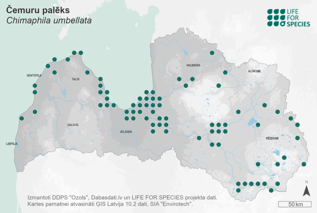 Summary. Common pipsissewa – Chimaphila umbellata. Rather common in Latvia, occurs throughout the country, although in recent decades there have been no data from some regions. The EOO is 60,058 km2, and the AOO – 532 km2. Despite a lack of recent data from some parts of the country, the species is still found throughout the country, although the number of localities in some regions may be small. It is assumed that the AOO exceeds the threshold of the VU category. Considering the forestry intensity in dry pine forests over the last 30 years, the eutrophication of dry pine forests, poor dispersal ability of this species, it is assumed that the number of individuals in Latvia has decreased by at least 15% over three generations (45 years), but not so much as to reach the threshold of the VU category. The population size, distribution and dynamics in Latvia have not been studied. C. umbellata grows in dry sparse pine forests, and in places with low competition from other plants subject to natural forest fires. The species is threatened by logging and the related soil damage, eutrophication of dry pine forests, establishment of spruce monocultures that make the habitat unsuitable for C. umbellata. The species requires minor soil disturbance to successfully spread with seeds. The percentage of the population in protected areas is unknown. It has been recorded, e.g., in the “Ances purvi un meži” and “Ovīši” Nature Reserves and the Ķemeri National Park. The distribution, especially in regions without recent data, and population size should be studied. Studies on appropriate management approaches for the conservation of this species and its habitats are necessary followed by actions. C. umbellata must be included on the list of protected species. The species protection plan should be developed.