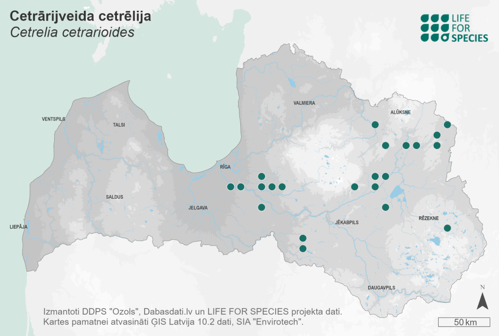 Summary. Cetrelia cetrarioides is found in North America, Europe and Asia. 31 localities are known in Latvia. The EOO is 16,845 km2, and the AOO is 128 km2. This epiphytic species grows on the bark of black alder (less often on other broadleaf trees) in old natural broadleaf forests with stable, high air humidity. In Latvia, it has also been found on ash, white alder, birch, aspen, linden, bird cherry and, in one case, on spruce. The species is threatened by logging, which not only reduces the number of suitable trees but also alters the forest microclimate, as well as by forest drainage. It is assessed as Vulnerable (VU) because the number of mature individuals does not exceed 1,000. The species should be included on the list of protected species in Latvia, as a species for which micro-reserves can be created (currently, it is not protected). It has been found in protected areas, for example, in the “Kupravas liepu audze” and “Gruzdovas meži” Nature Reserves; however, most (approximately 80%) of the localities are outside protected areas. The species’ localities should be protected by preventing logging and other activities that alter the natural microclimate.