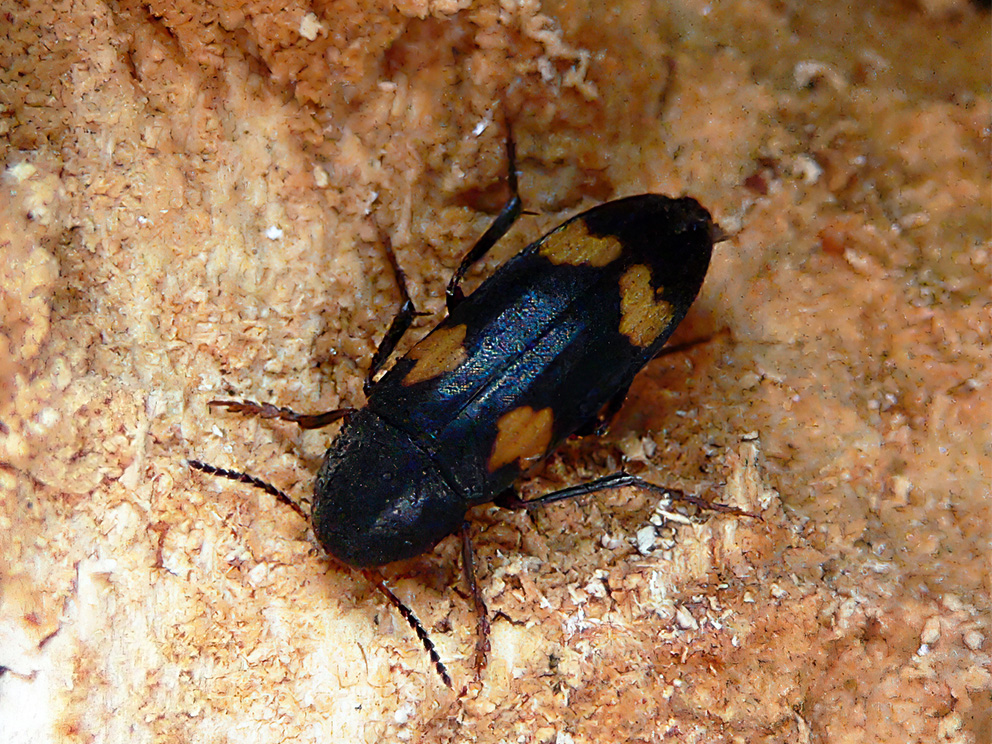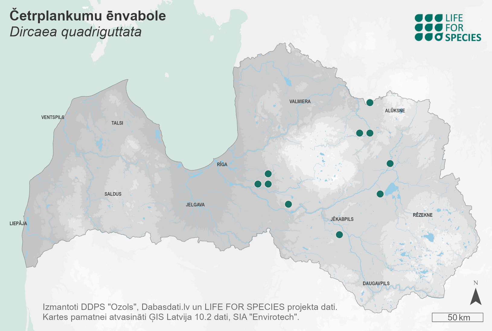 Summary. False darkling beetle – Dircaea quadriguttata. Its distribution area overlaps with the distribution of broadleaved and broadleaved-mixed forests. The species is found from France to north-eastern China and Japan, and from Finland to northern Italy (Nikitsky 2020). Latvia is located at the north-eastern extent of the distribution range, but is not isolated from other regional populations. In Latvia, the species occurs only in the central and eastern part of the country (Telnov 2002; Telnov et al. 2006, 2010, 2011, 2016; Barševskis et al. 2008). The EOO is ~8,747 km2, and the AOO is 56 km2. The potential EOO and AOO are likely higher. Studies on the size, status and trends of the Latvian regional population have not been carried out. On average, one or a few individuals were detected at each site. The species inhabits broadleaved and mixed forests with oak or aspen and a large amount of decaying wood, as well as wooded meadows. In other countries, it also develops in birch wood (Nikitsky et al. 1996; SLU Artdatabanken 2020; U. Roosileht, personal report). Both adult beetles and larvae dwell under bark and in decaying wood. The species is included in the list of indicator species of old and primeval forests of Central Europe (Eckelt et al. 2017). Threats have not been specifically studied in Latvia. Part of the existing wooded meadows with old oaks in Latvia are managed to preserve the habitats and species of EU importance, therefore, the existence of this habitat in Latvia is not threatened in the next 10 years. During the last 20 years, with the intensification of logging, the area covered by old aspen and aspen mixed forests and the number of old aspens in commercial forests has significantly decreased, and this decrease is ongoing. This affects the area of suitable habitat of D. quadriguttata and is likely to result in a significant population decline within the next decades. The species is assessed as Near Threatened (NT) due to its small AOO, low number of locations (7), and the continuing decline in habitat area and quality. It is not included in international and national regulatory acts and is not protected. There is no need to revise its current protection status in Latvia. Less than half of the known localities are in protected areas, for example, in the “Ābeļi”, “Aizkraukles purvi un meži”, “Barkavas ozolu audze”, “Lubāna mitrājs” and “Melnupes meži” Nature Reserves. Preserving the habitat and substrate – old, decaying deciduous trees – is required to protect the Latvian regional population. Ensuring the habitat continuity is equally important.