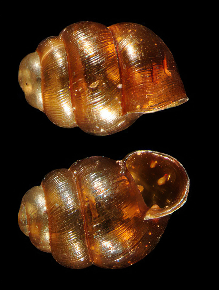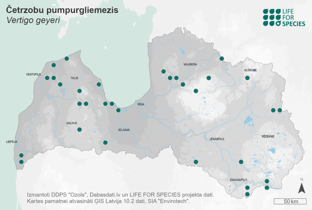 Summary. Geyer’s whorl-snail – Vertigo geyeri. The species is distributed throughout Europe and found in all of Latvia’s neighbouring countries except Belarus. In Latvia, it is scattered and relatively rare. At least 90 localities of the species are known. The EOO is 66,743 km2, and the AOO – 192 km2. The regional population in Latvia is fragmented, the localities are isolated, but the overall status is stable, although the species has been lost from some localities due to inappropriate habitat management. The number of snails per square metre can vary from a few to several tens of individuals; and can be influenced by climatic conditions (winter snow cover, prolonged drought, heat or rainfall) and habitat management. The species typically inhabits calcareous fens, transitional mires and grasslands with high but stable groundwater levels, low sedge and bryophyte communities. When the habitat overflows, it moves upwards on plant stems up to 10–30 cm. The main threats in Latvia are overgrazing and related trampling of habitats, changes in hydrological conditions in or near habitats (drainage). Natural factors threatening the species include overgrowth of habitats with trees and shrubs, and prolonged periods of drought and heat. In areas where the species is present, it is necessary to continue habitat management where it has been or is being carried out. It is likely that extensive grazing is the most convenient way to maintain the species’ habitats and the removal of trees and shrubs is recommended. Where wild ungulates graze in the habitat, cutting or mowing woody sprouts every few years is sufficient. The hydrological conditions of the habitat and its surroundings should not be altered by draining. The species is assessed as Endangered (EN) due to its fragmented regional population and threats from economic activities, as well as its small AOO, which is less than 2,000 km2. It is included in the 2nd edition of the Red Data Book of Latvia (Rudzīte 1998). It is a species of EU importance and is protected in Latvia, for which conservation micro-reserves can be established. The legal status of the species must be maintained. Most of the localities are found in protected nature areas. It is recommended to develop individual habitat management plans for each of the protected areas where the species occurs. The habitat management required for the preservation of the species might conflict with the management actions required for the conservation of protected habitats of EU importance (Cameron et al. 2003).