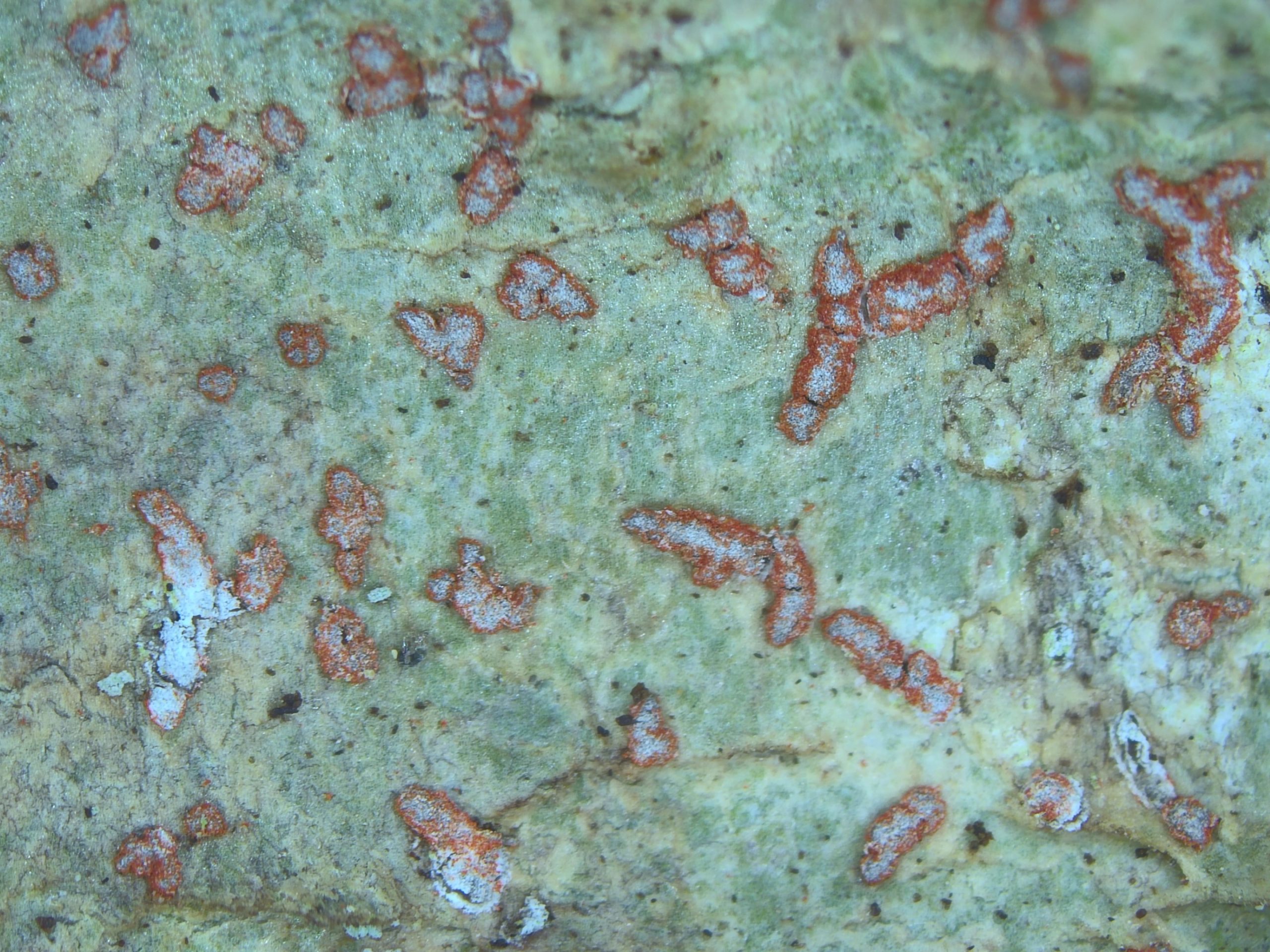 Summary. Coniocarpon cinnabarinum is a cosmopolitan species – found in North and South America, Asia, Africa, Australia and Europe. In Latvia, the species was found in two localities in the 19th century. In the 20th century, the herbaria attributed to it turned out to be incorrectly identified. Considering the information available at that time and the field surveys carried out in 2022, the species was initially assessed as Regionally Extinct (RE). However, additional published information was later discovered about the possible detection of the species in 2014 in the Slītere National Park near the Šlītere Lighthouse, and in 2025 it was found both repeatedly in the same place and nearby in the Slītere National Park. Consequently, the species’ extinction risk category was changed to Critically Endangered (CR) in 2025. Both the EOO and the AOO are 8 km2. In Latvia, it occurs in very old natural broad-leaved forests on relatively smooth rowan and hazel bark. The species is sensitive to logging, which not only reduces the number of suitable trees but also alters the forest microclimate. It is a protected species in Latvia. Its legal protection status must be maintained. All known localities are in the Slītere National Park. To preserve the species, the habitats inhabited by the species must be protected by preventing logging and other activities that change the natural microclimate of the forest.