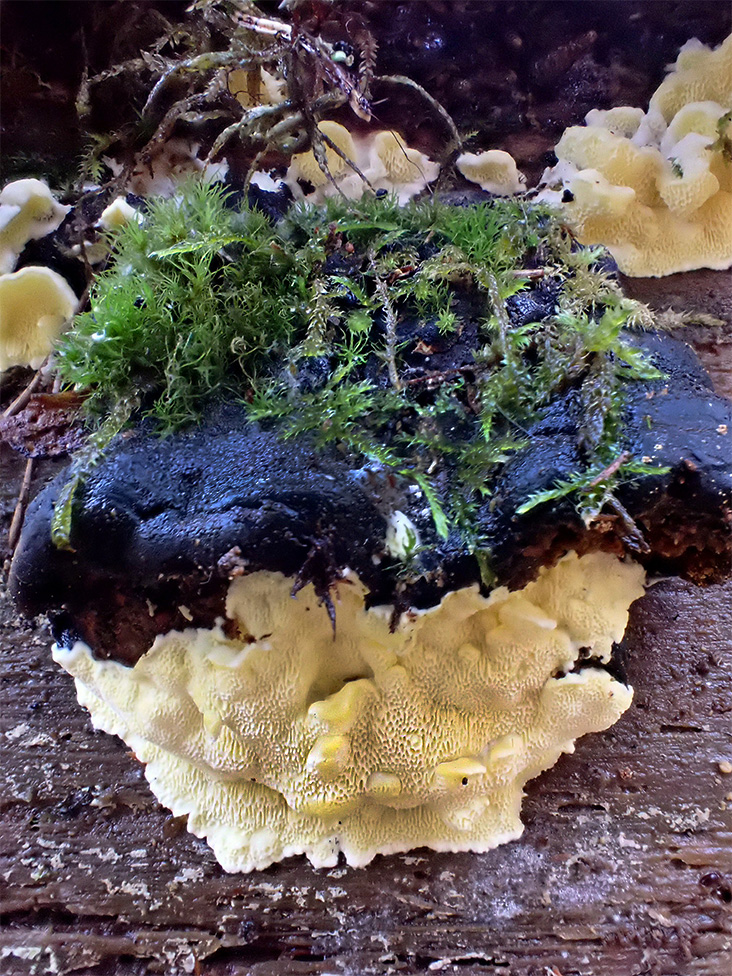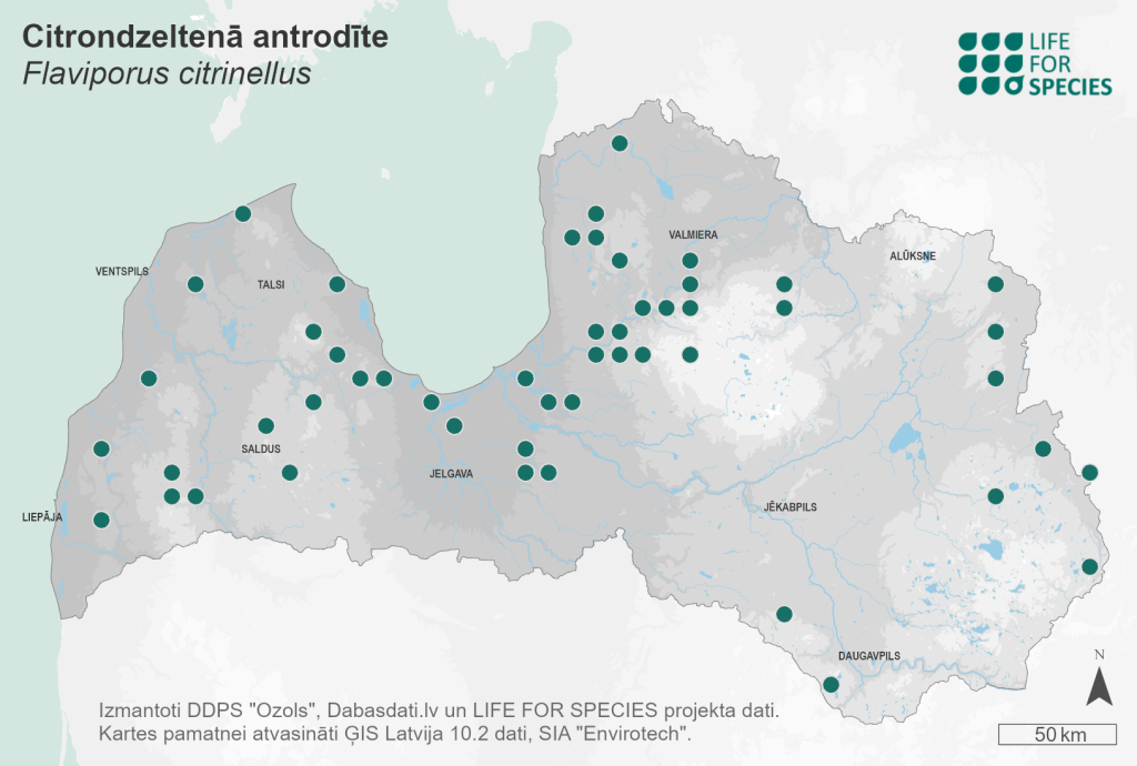 Summary. Lemon-colored antrodiella – Flaviporus citrinellus. Found only in Europe, mainly in the north (Finland, Sweden), with some localities in mountainous regions. In Latvia, 86 localities in different regions are known. The EOO is 64,178 km2, and the AOO – 304 km2. The species is considered very rare worldwide, with an estimated total of about 750 localities and about 3,000 mature individuals. There are insufficient data on the size of the regional population in Latvia and its changes, but globally it is relatively important, and the number of mature individuals could be about 400. It is a wood saprotroph, causing white rot. It grows on moderately to severely decayed spruce logs previously decomposed by Fomitopsis pinicola. The species is threatened mainly by the loss of suitable habitats, such as old spruce forests with moderate to low disturbance. The habitat should contain high volumes of coarse woody debris. It is assessed as Vulnerable (VU) due to a very small regional population. The species is not listed as a species of EU importance and is not protected in Latvia. It is proposed to be included on the list of protected species for which micro-reserves can be established. About half of the species’ localities are in protected nature areas, e.g. the Gauja and Ķemeri National Parks, the “Istras pauguraine” Nature Park, and the “Vjadas meži” Nature Reserve. Research is needed on the distribution, ecology and threats to the species.