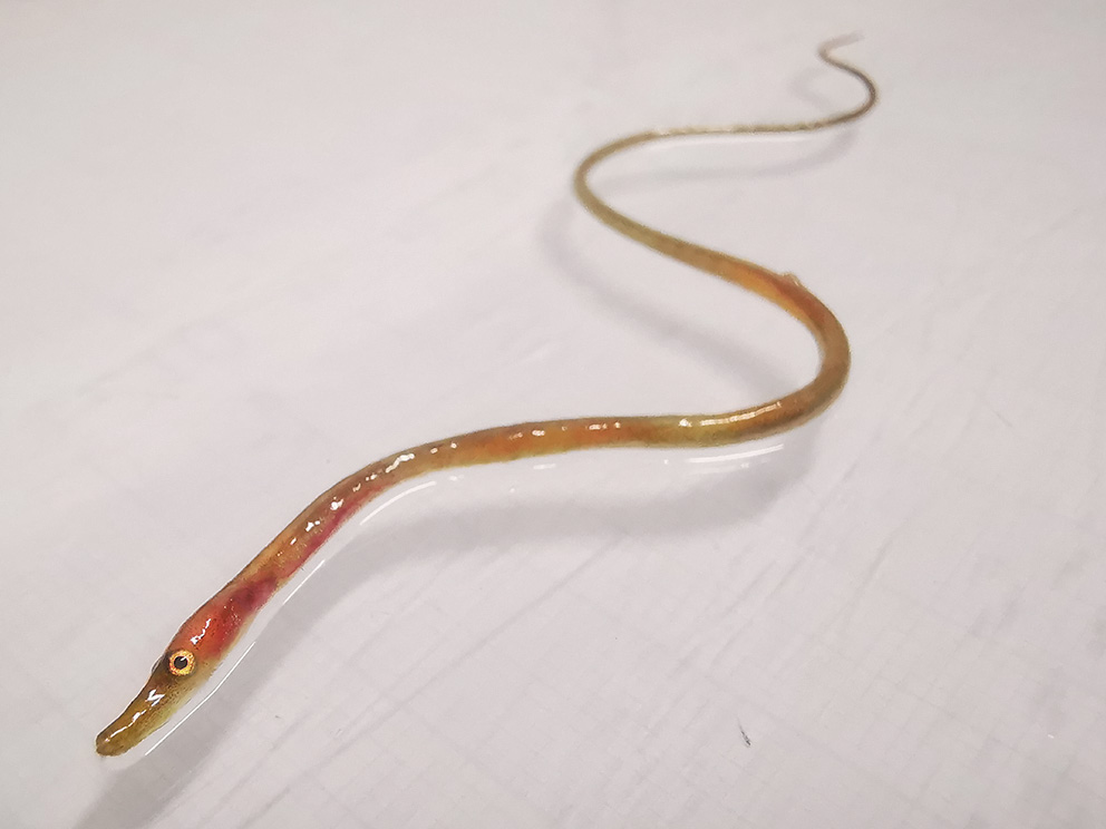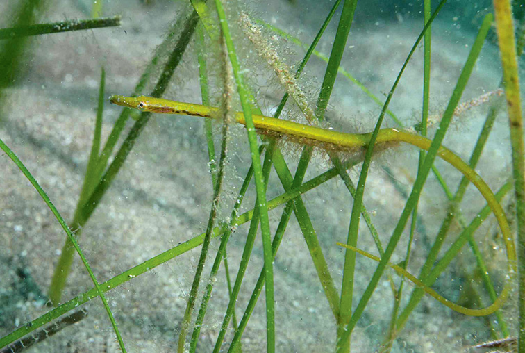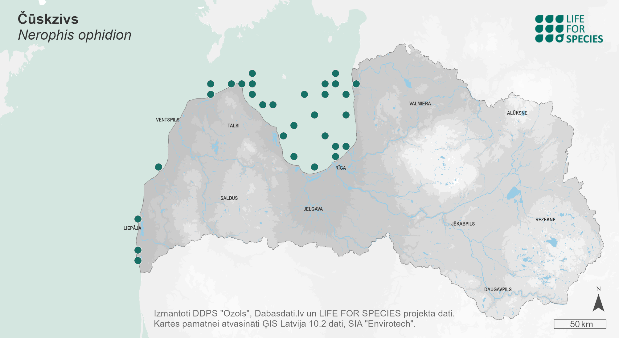 Summary. Straightnose pipefish – Nerophis ophidion. The range in Europe includes the Northeast Atlantic and adjacent coastal marine waters. It is widespread in the Baltic Sea, the North Sea, the coasts of the British Isles and the Iberian Peninsula, the Mediterranean Sea and the Black Sea. The species is relatively rare in Latvian territorial waters, occurring mainly in the Gulf of Riga, both in coastal and open sea areas. In the open Baltic Sea, it is found only in the coastal zone. The EOO is 21,138 km2, and the AOO – 160 km2. In the Baltic Sea, the regional population of the species is assessed as Least Concern (LC), with no significant long-term trends of population decline or increase. No specific studies have been carried out on the regional population size and changes in Latvian territorial waters. The species is found in coastal areas at depths of up to 15 m in sites in well-aerated water and with the seagrass Zostera spp. on sandy or carbonate rocky substrates composed mainly of mussel shells. The main threat to the species is the loss of suitable habitats. As there is currently insufficient information to assess the extinction risk of the species at the regional level, it has been assigned the category Data Deficient (DD). It is not on the lists of international agreements, species of EU importance or Latvian protected species lists. Monitoring methods customised to detect the species are needed to clarify its distribution and regional population trends in Latvia. Studies are also needed to determine the areas of the species' habitats and their changes. Considering that there is currently insufficient data to assess the extinction risk of the species in Latvia, the necessity for conservation of the species needs to be reviewed in the future once appropriate studies have been carried out.