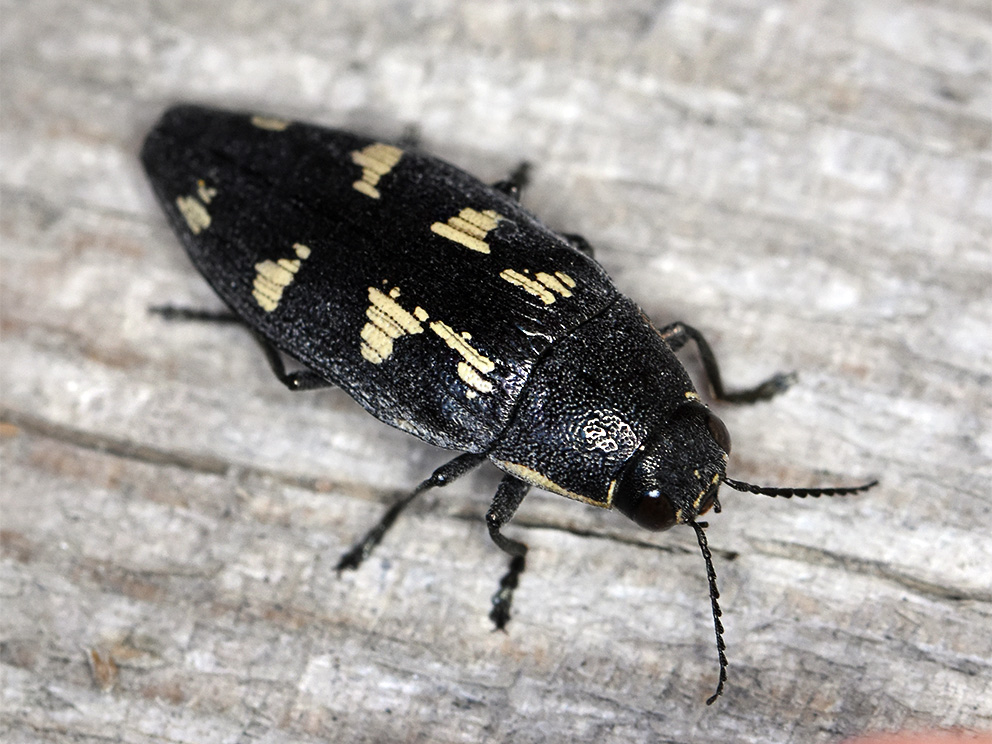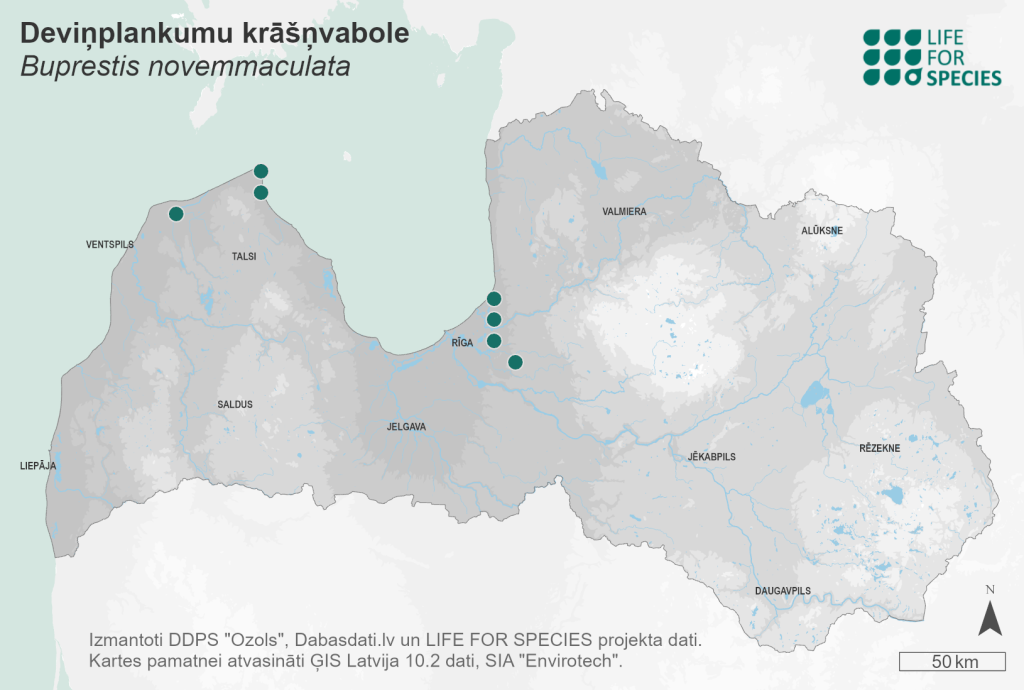 Summary. Jewel beetle – Buprestis novemmaculata. The species is distributed from south-western Europe to Fennoscandia and reaches Kazakhstan in the east of the range. Latvia is in the north-western part of the distribution range. In Latvia, the species occurs in dry, open pine forests including burnt pine forest stands. 24 localities are known. The EOO is 6,000 km2, and the AOO is 56 km2. In Fennoscandia, the regional populations are fragmented and declining. The state and trends of the Latvian regional population are not fully understood, but it has been concluded that the AOO and the regional population are declining. Larvae develop in decaying Scots pine wood favouring large-diameter fallen logs, sometimes also in smaller standing trunks, but always prefer sun-exposed areas. The main threats are the decline of old-growth pine forests, the general decline of decaying wood in forests, and the reduction of the area and intensity of forest fires. Preservation of old-growth, open pine forests and the long-term availability of decaying wood in forests are crucial for the protection of the species. It is necessary to implement appropriate management measures, such as controlled forest burning, to maintain and artificially create the habitat. The species is assessed as Vulnerable (VU) due to the small AOO and the continuous decline of AOO and the regional population. Buprestis novemmaculata is not included on the list of protected species of EU importance and is not protected in Latvia. The species is proposed to be included on the list of protected species.