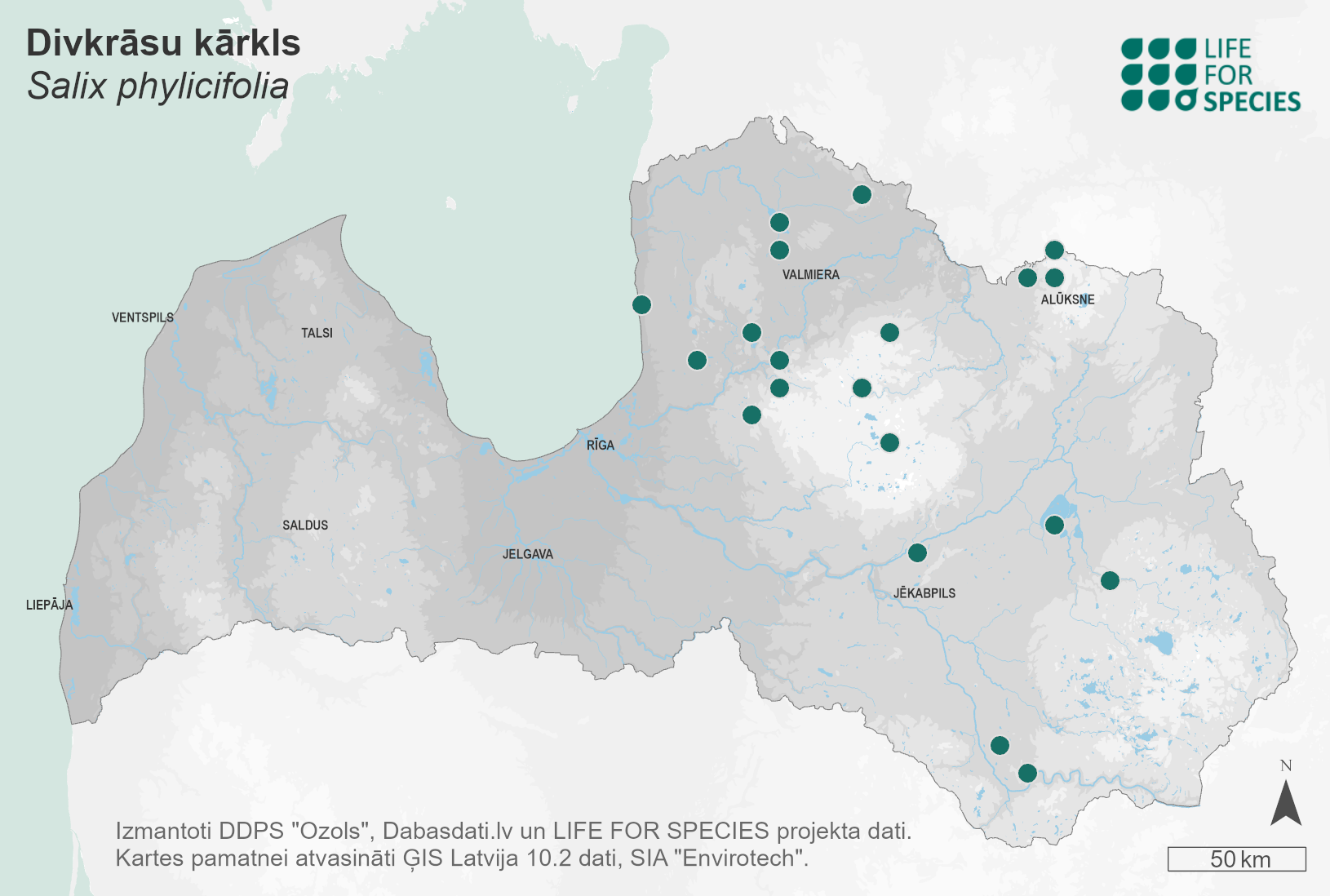 Summary. Tea-leaved willow – Salix phylicifolia. The species is relatively common in northern Latvia, but not in southern and western Latvia. The AOO is 80 km2, and the EOO – 18,249 km2. Over the past 30 years, it has been found in about 20 localities, and compared to the data of earlier recorded localities, the EOO and the AOO have significantly decreased. The species has not been found in the previously known localities in western Latvia, the vicinity of Riga and eastern Latgale. However, S. phylicifolia may be more common than recorded because the species is similar to the common species S. myrsinifolia and S. starkeana and may not have been recognised during floristic studies. S. phylicifolia grows in wet floodplain grasslands, shores of water bodies, fens and other wetlands. Since S. phylicifolia is a species with a distinctly boreal distribution that occurs on the range border in Latvia, this species may be significantly affected by the increased risk of drought caused by global climate changes. New localities may be found, especially in the northern and eastern parts of the country. Approximately 40% of the localities occur in protected areas, e.g., the Gauja National Park, the “Mežole” Nature Reserve, and the “Veclaicene” and “Vecpiebalga” Protected Landscape Areas. The population size, distribution and threats should be specified.