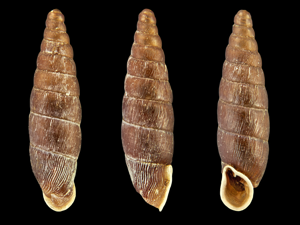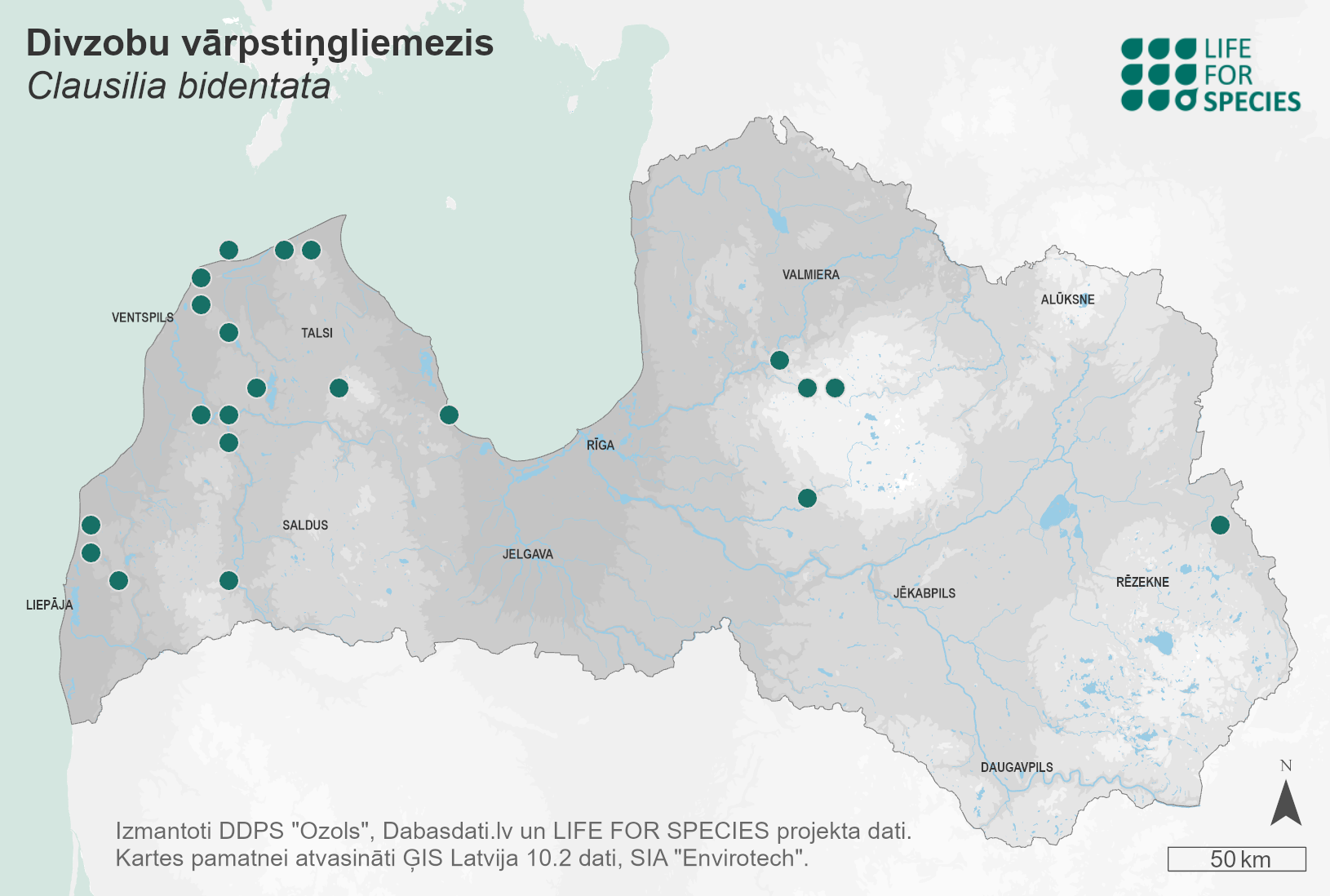 Summary. Door snail – Clausilia bidentata. The species’ distribution corresponds with the oceanic climates in Europe. It is widely distributed in Western Europe. The species is found in all of Latvia’s neighbouring countries. It is distributed throughout Latvia, but is more frequently found and occurs in larger numbers in Western Latvia, with 38 known localities. The EOO is 31,984 km2, and the AOO – 100 km2. The potential AOO is larger but does not exceed 2,000 km2. The number of individuals per square metre can vary from one to 37, with an average of six individuals. In snail communities, the species is most often represented by up to 1% of the total number of individuals of snail species. It is found in forests under litter, on fallen logs, under their bark and in humid weather on tree trunks. It is important that there is abundant understorey in the habitats, as well as dead wood and deciduous trees (aspen, broadleaved trees). In Latvia, the main threats are fragmentation and isolation of natural habitats, their reduction and degradation due to economic activities – mainly forestry. The practical protection of forest habitats of EU importance outside protected nature areas is of great importance for the conservation of the species. The species is assessed as Vulnerable (VU) based on threats from economic activities and considering its AOO. It is included in the 2nd edition of the Red Data Book of Latvia (Pilāte 1998). It is a protected species in Latvia, and it is also proposed to be included on the list of species for which conservation micro-reserves can be established. Most of the localities are within protected nature areas.