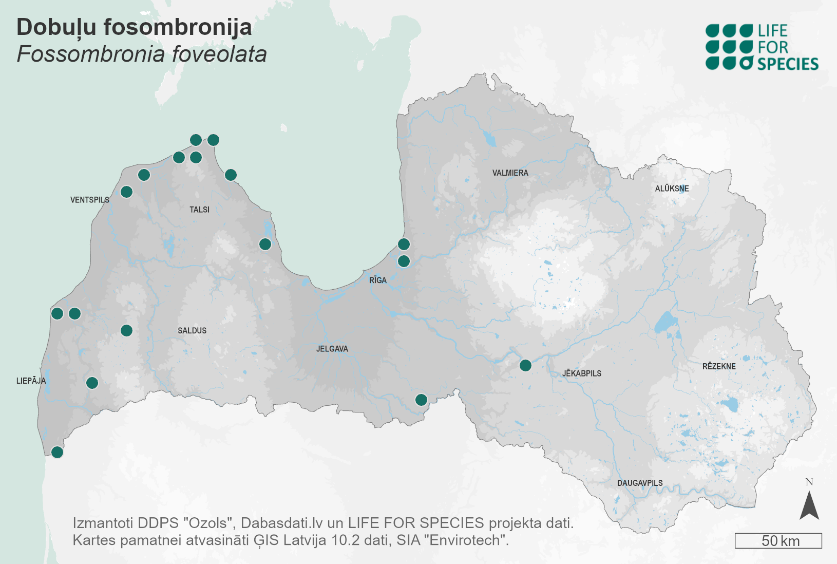 Summary. Pitted frillwort – Fossombronia foveolata. The liverwort species is found in the temperate zone of the northern hemisphere in most of Europe, as well as in the Caucasus, Iceland, Turkey, North Africa, North America, etc. It was first found in Latvia by A. Bruttan in 1887. Currently, 28 localities are known for the species in Latvia, most of them in the western part of the country. Three localities were found in the vicinity of Ādaži, one in Zemgale near Bārbele and one in West Selonia on the left bank of the Daugava opposite Rīteri. EOO is 28,984 km2, and AOO is 100 km2. The size of the population in Latvia is not known exactly, but it is relatively small. The species grows in wet coniferous forests, coastal fens, inter-dune depressions, wet heaths, sandy and wet lake shores, transition mire depressions, on animal paths in fens, wet and peaty grasslands and swamp forests. In Latvia, the species is threatened by pollution of lakes with additional biogenic elements, overgrowth of lakes, drainage, conversion VU of forest land to agricultural land, conversion of natural forests to monocultures, clear-cutting and removal of old growth. In Latvia, it is assessed as a Vulnerable (VU) due to its small AOO and a projected continuous decline in both the AOO and habitat quality. A protected species in Latvia. The legal status of the species must be maintained. Half of the localities are in protected nature territories – the Grīņi Strict Nature Reserve, the “Ziemupe”, “Klāņu purvs”, “Lieluikas un Mazuikas ezeri” Nature Reserves and the Slītere National Park. The species is currently protected within the framework of protection of habitats of specially protected forests, grasslands and lakes. The conservation of the species requires monitoring and management of Lake Klāņezers, Lake Mazuika and Lake Ummis localities, a comprehensive assessment of the condition of Lake Klāņezers and the potential for stabilising its water level, as well as the status and dynamics of the species’ population. A species conservation and habitat management plan should be developed.