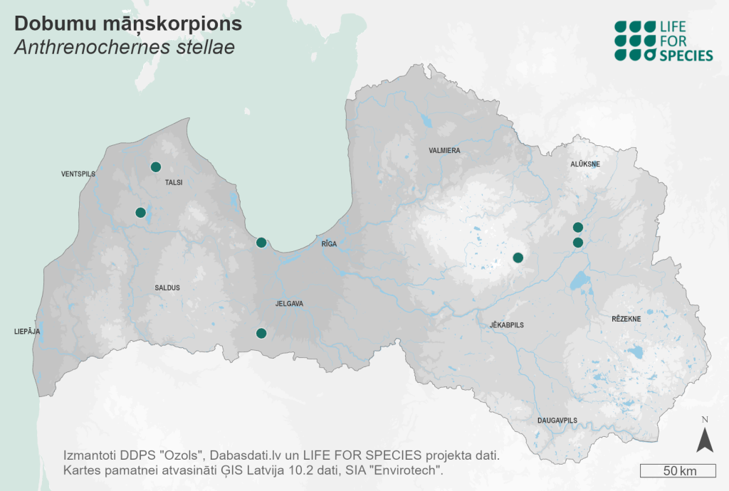 Summary. Stella’s pseudoscorpion – Anthrenochernes stellae. Distributed in Central and Northern Europe (Fjellberg, Lissner 2016). In Latvia, the species has been recorded from ten localities (some of them situated very close) or from six sites. The most recent record is from 2021 from Tērvete (southern Latvia), which may indicate a more widespread occurrence of the species in Latvia. The EOO is 16,443 km2, and the AOO – 36 km2. In Europe, the species is observed to be declining (Ranius et al. 2005). The regional population in Latvia is currently estimated to be small. Suitable habitats for the species are wooded meadows, parks with old deciduous trees with hollows (Molander 2012), and in Latvia also forests on slopes if suitable trees are present. The species requires old, hollow deciduous trees, mainly oaks, limes and beeches, which grow in forests, but receive sufficient sunlight. The species is therefore threatened by the age-related mortality of old hollow trees in areas where A. stellae occurs, and the lack of potentially habitable trees within the species’ reach. The species is assessed as Vulnerable (VU) due to the small number of localities, limited dispersal ability and habitat specificity. It is a species of EU importance and a protected species in Latvia for which micro-reserves can be established. The legal status of the species must be maintained. Seven localities are in protected nature areas – the “Lubāna mitrājs” Nature Reserve, the Ķemeri National Park and the Moricsala Strict Nature Reserve. The conservation of the species requires the protection of trees or parks occupied by the species, as well as consideration of the protection of potential trees suitable for the species. Further conservation planning requires studies of the life cycle and the ecology of the species, e.g. trees it inhabits, its carriers, activity periods, mating periods, etc.