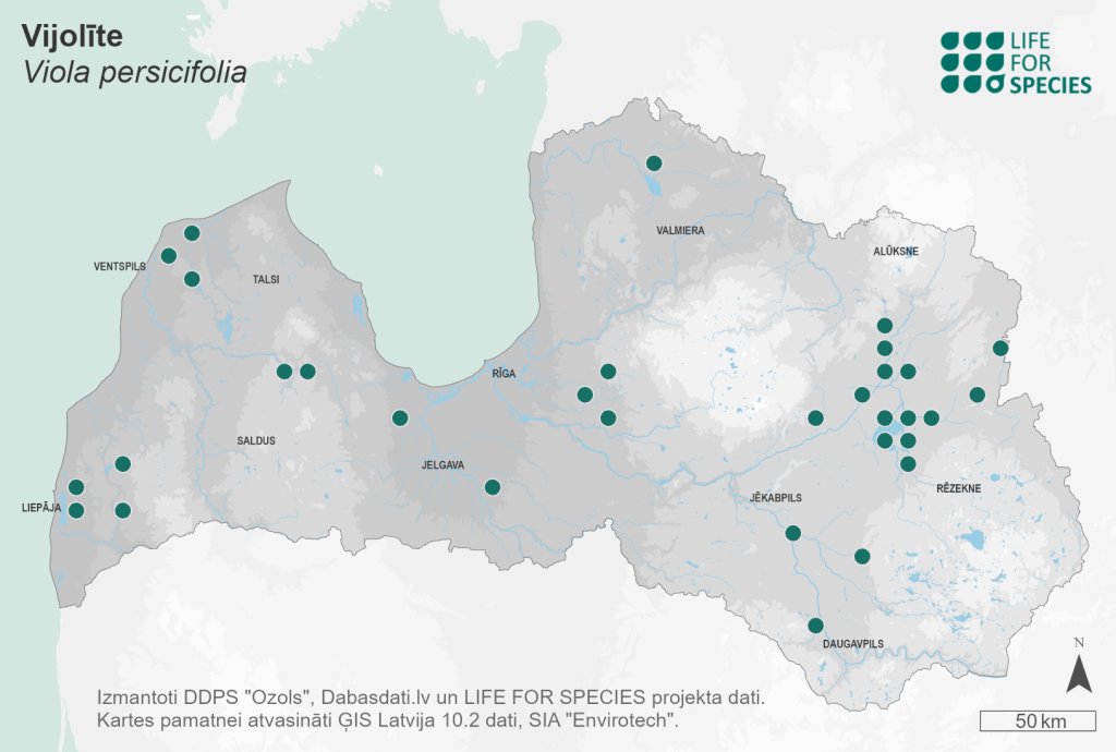 Summary. Fen violet – Viola stagnina. Rare in Latvia. The EOO is 28,090 km2, and the AOO – 60 km2. The EOO, compared to the end of the 20th century, has increased, but this is due to the increased intensity of floristic inventories. The species occurs mainly in eastern Latvia, particularly in the lowland of Lake Lubāns, which is the core area of this species. Typical habitats for the species are wet and marshy meadows, riverbanks and lakeshores, and banks of ditches. Periodically wet soils and low-sward vegetation are typical habitats of this species. Most often, it has been found in grasslands with Cnidion, Calthion and Molinion plant communities. V. stagnina is threatened by degradation of grasslands, drainage and prolonged water stagnation (e.g., due to beaver activity), invasive species, natural succession and inappropriate management. The species has been found in the Ķemeri National Park, the “Abavas senleja” and “Dvietes paliene” Nature Parks, the “Lubāna mitrājs”, “Sitas un Pededzes paliene” and “Liepājas ezers” Nature Reserves, and in one microreserve. There are fewer than ten sites outside protected areas. However, the occurrence in protected areas does not guarantee the protection of the species if the grasslands are not properly managed. To ensure the conservation of V. stagnina, it is essential to ensure appropriate semi-natural grassland management and restoration and to prevent semi-natural grassland fragmentation.