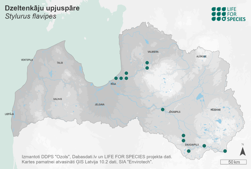 Summary. River clubtail – Stylurus flavipes. Palaearctic species, distributed from the Atlantic coast of south-western Europe to Japan (GBIF 2022). In Latvia, the species is restricted to a few rivers (~8 to 9 localities). Its distribution is associated with the Daugava and Gauja rivers, which are among the largest rivers in Latvia. However, it has not been found in other large rivers – the Salaca and Venta (Kalniņš 2017). The EOO is 11,171 km2, and the AOO – 64 km2. The current regional population size in Latvia is estimated to be >1,000 individuals. In Latvia, the species inhabits large rivers or sections of rivers with sandy substrates, with no or a very thin layer of silt, in sites with poorly developed vegetation. The hydrological regime of these watercourses is natural, with more or less pronounced spring floods that remove silt and deposit sand, forming open sandbanks or other mineral shoals in summer (Kalniņš 2017). Adult dragonflies are mainly found above watercourses or on land, on open sand or other mineral substrates near watercourses. Larvae live on the riverbed in non-vegetated sites. HPP dams and reservoirs and coastal development alter the natural hydrological regime, reducing the impact of spring floods (silt removal and sand deposition) and reducing the quality of the species’ habitats. Most of the regional population would be destroyed by the construction of large hydroelectric power plants in the rivers inhabited by the species. The species is assessed as Near Threatened (NT) due to its small AOO and EOO. It is included in the 2nd edition of the Red Data Book of Latvia (Spuris 1998). It is a species of EU importance, is protected in Latvia and is proposed to be included on the list of species for which micro-reserves may be established. Three of the known localities are in protected nature areas. Conservation measures include the improvement of water quality in the rivers where the species lives, the maintenance of a natural hydrological regime as far as possible, etc. Studies of the species’ distribution and abundance, habitats and ecology are needed to improve conservation.