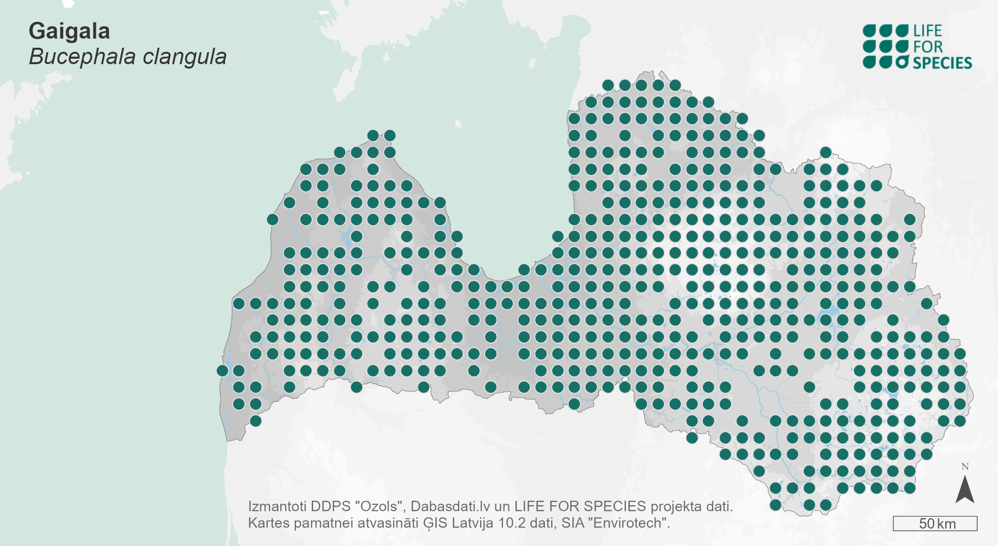 Summary. Common Goldeneye − Bucephala clangula. In Latvia, the distribution increased considerably between 1980–1984 and 2000–2004, while no considerable change in distribution occurred between 2000–2004 and 2013–2017. The AOO of the breeding population is 6,484 km2, the EOO – 82,342 km2. The breeding population is estimated at 1,300–15,000 pairs (2,600–30,000 adult individuals). The population is stable in the short term; the long-term trend is unknown, but a 12% decrease is observed when the population change is calculated over three generations. During the breeding season, the species inhabits rivers in the forests, oxbows, lakes and fish ponds. At wintering sites, the main threats are potential oil spills and poisoned food that is ingested while foraging around sewage spills. The species is hunted, but the impact of hunting in Europe as a whole is unknown. Forestry depletes breeding habitats. Monitoring of the population is ongoing. The legal status of the species does not need to be changed in Latvia. It is important to maintain trees with large cavities in the forest to conserve the breeding habitat of the species.