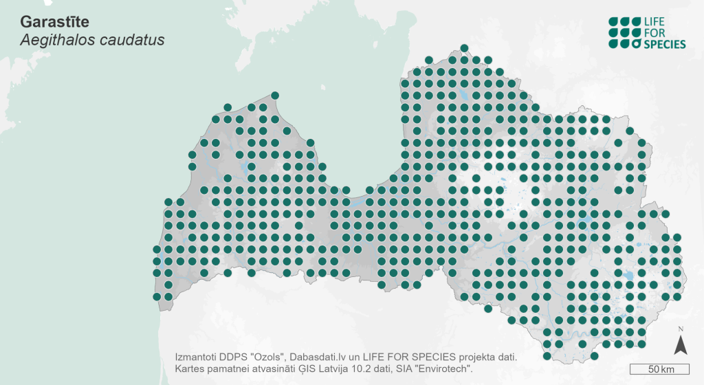 Summary. Long-tailed Tit − Aegithalos caudatus. In Latvia, the distribution increased between 1980–1984 and 2000–2004, while no considerable change in distribution occurred between 2000–2004 and 2013–2017. The AOO of the breeding population is 4,764 km2, the EOO – 84,205 km2. The breeding population is estimated at 3,758– 74,784 pairs (7,516–149,568 adult individuals). The population is declining in the long term, and the short-term trend is classified as uncertain, however, recent estimates suggest that the population could have declined by 45% over ten years. During the breeding season, the species inhabits moist deciduous and mixed forests, often – alder and birch stands. Forestry activities are a major threat. The European assessment also notes that the species suffers from nest predation and that increased mortality during severe winters may have a lasting impact on the population. Monitoring of the population of the species is ongoing. The legal status of the species does not need to be changed in Latvia. Suspension of logging during the breeding season and the reduction of fragmentation are required to conserve the species.