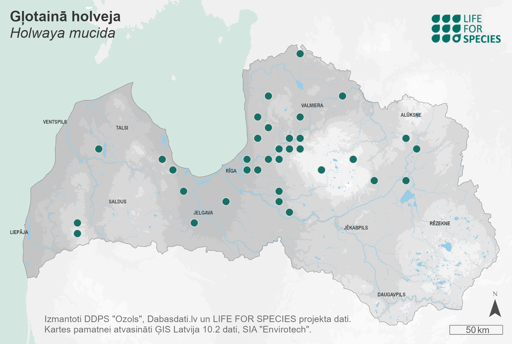 Summary. Tapioca club – Holwaya mucida. Mainly distributed in Europe, North America, and also in parts of Asia (Japan). It is rare in Latvia with 45 known localities in different regions up to 2022. The EOO is 37,230 km2, and the AOO – 180 km2. No information is available on the distribution changes due to a lack of studies. There are insufficient data on the regional population size and changes. The number of mature individuals probably does not exceed 1,000. It is a wood saprotroph. In Latvia, as in other parts of Europe, it is found in deciduous forests and in old parks on logs of deciduous trees, mainly lime. The distribution of the species is influenced by the removal of coarse woody debris in broadleaved forests and parks, and by the decline in the proportion of old deciduous forests. It is assessed as Vulnerable (VU) due to its very small regional population. The species is not listed as a species of EU importance and is not protected in Latvia. It is proposed to be included on the list of protected species. It is found in protected nature areas – the Gauja and Ķemeri National Parks, the Moricsala Strict Nature Reserve, etc. Most localities are outside these areas. It is recommended to preserve logs of large deciduous trees, especially lime trees, for potential habitat of the species. Studies on the population size, distribution and trends, life cycle and ecology are needed.