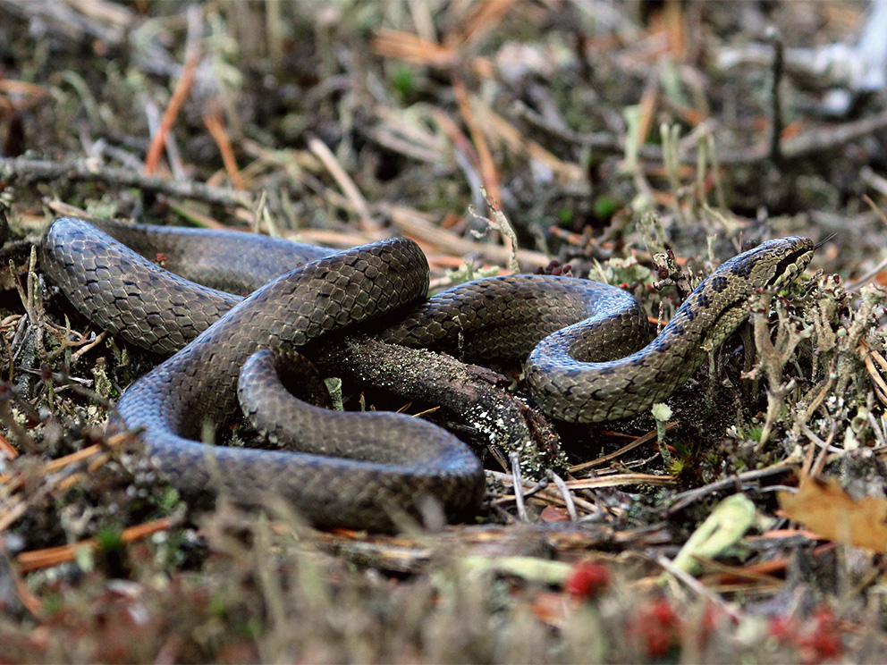 Summary. Smooth snake – Coronella austriaca. Widespread across Europe with scattered localities in the northern part of its range. The Latvian regional population is completely isolated, located at the northern limit of the species’ range. The AOO is 64 km2, and the EOO – 4,327 km2. The species’ range in Latvia has been steadily decreasing since the beginning of the 20th century. The regional population is estimated to be 350-1,150 individuals. The largest locality is in the degraded Sloka Mire (the Ķemeri National Park), where it occupies mire areas where the groundwater table has been lowered; at present, the habitat area is decreasing as the area overgrows with forest. Elsewhere in the Ķemeri National Park, subpopulations of only a few dozen individuals have been recorded. All localities in Latvia are in the coastal zone, almost exclusively associated with raised bogs, where they inhabit degraded, partially drained bog margins and fragments of dry habitats (open and semi-open inland dunes and embankments). The species is threatened by housing and urbanisation, road and railway construction, tourism and recreation, and changes in ecosystems due to alteration of hydrological regime. It is assessed as Endangered (EN) on the basis of small EOO and AOO and declining distribution and population trends; the regional population is small, fragmented and geographically completely isolated. It is a species of EU importance and protected in Latvia, for the conservation of which micro-reserves may be established. The legal status of the species must be maintained. All known localities are in protected areas (the Ķemeri and Slītere National Parks, the “Engures ezers” Nature Park, and the “Ādaži” Protected Landscape Area). The necessary research and conservation measures are described in the species conservation plan and in the nature management plans of the “Ādaži” Protected Landscape Area and the Ķemeri National Park. The measures include the creation of more open habitats. The restoration of mires, which leads to increased water saturation of peat, is not acceptable in the species’ localities. Conservation measures must also be developed for subpopulations in the Slītere National Park and the “Engures ezers” Nature Park.