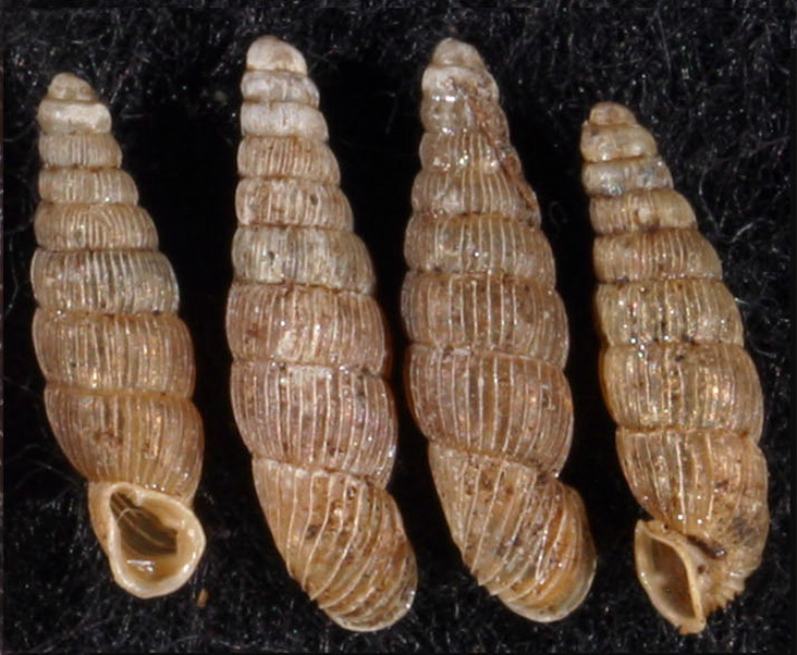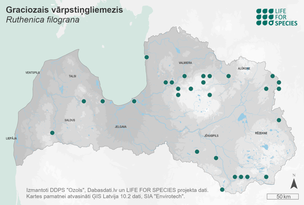 Summary. Door snail – Ruthenica filograna. Widespread throughout Central and Eastern Europe and found in all of Latvia’s neighbouring countries. It occurs throughout Latvia, but not frequently, with 50 known localities. The EOO is 48,386 km2, and the AOO – 168 km2. The potential AOO is larger but does not exceed 2,000 km2. The number of individuals per square metre can vary from one to 27, with an average of seven individuals. In snail communities, the species is most commonly represented by up to 1% of the total number of individuals of snail species. It occurs in forests on calcareous soils and is found under litter. It is important that there is abundant understorey, dead wood and deciduous trees (aspen, broadleaved trees). The species is occasionally found in calcareous fens. The main threats in Latvia are the fragmentation and isolation of natural habitats, their reduction and degradation due to economic activities – mainly forestry. The practical protection of forest habitats of EU importance outside protected nature areas is of great importance for the conservation of the species. The species is assessed as Vulnerable (VU) based on its fragmented regional population, threats from economic activities and considering its AOO. It is included in the 2nd edition of the Latvian Red Data Book of Latvia (Pilāte 1998). It is a protected species in Latvia. The legal protection status of the species must be maintained. Most of the localities are found in protected nature areas.