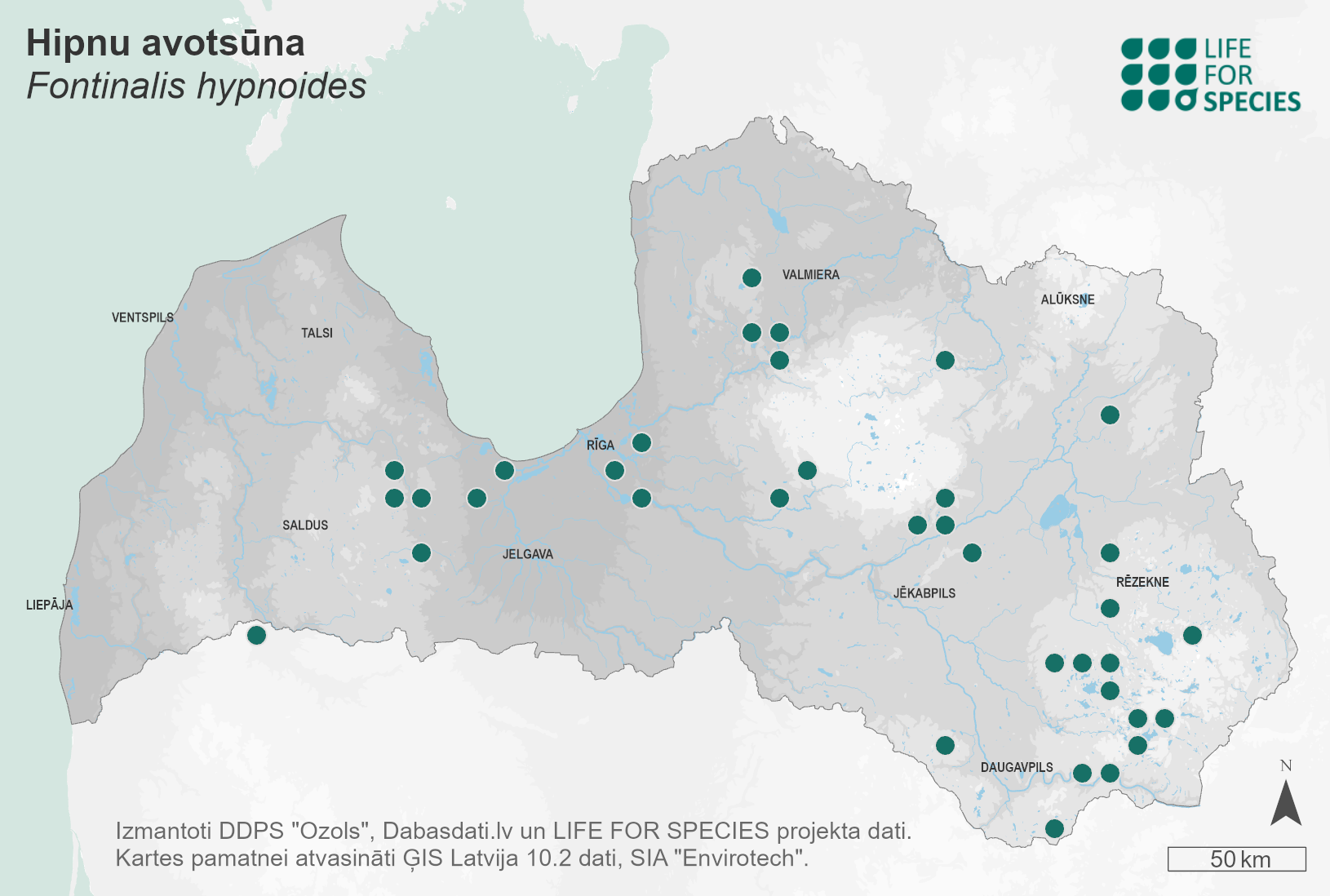 Summary. Quell willow moss – Fontinalis hypnoides. A widespread moss in Europe, Asia, North America and Greenland. It was first found in Latvia by J. Mikutowicz in 1901. In Latvia, there are about 40 known localities of this species in almost the whole territory of the country, except for the middle part, west and north of Kurzeme. EOO is 34,378 km2, and AOO is 152 km2. Its regional population in Latvia is small. In Latvia it grows in clean clear- water eutrophic, less often clear-water mesotrophic and brown-water semi-dystrophic lakes on sandy or muddy bottom to a depth of 1.5-2 m, as well as in clean rivers (riffles and pools), sometimes also in oxbows. In Latvia, the species is threatened by pollution, overgrowth, deterioration of water quality, intensive agriculture, intensive recreation and development in lakes and their shores, artificial changes in lake water levels, installation of hydroelectric power plants in reservoirs. It is assessed as Near Threatened (NT). A protected species in Latvia. The legal status of the species must be maintained. The smallest part of the known localities is in specially protected nature territories – the Ķemeri and Gauja National Parks. To protect the species, a conservation and habitat management plan should be developed, and knowledge about its distribution in Latvia should be further developed.