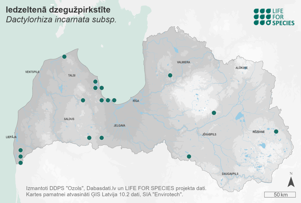 Summary. Early marsh orchid – Dactylorhiza incarnata subsp. ochroleuca. It is rare in Latvia, mainly found in the western part of the country. The EOO is 42,972 km2, and the AOO – 116 km2. The EOO has increased, but this is due to the increased intensity of flora inventories. There are no data on the size of the subpopulations and population dynamics. Most often, there are 1–10 individuals per site. In Latvia, D. incarnata subsp. ochroleuca is found mainly in alkaline fens, and sometimes in alkaline fens with spring discharges. It is threatened by drainage of fens, the cessation of fen management, their conversion to arable land and peat extraction. Most D. incarnata subsp. ochroleuca localities are in protected areas, e.g., a significant subpopulation occurs in the “Engures ezers” Nature Park. It is necessary to estimate the population size, update the knowledge on the distribution, and determine the most important sites for conservation. Drainage of fens should not be permitted; in some places, fen restoration and management (mowing, haymaking or extensive grazing) are necessary.