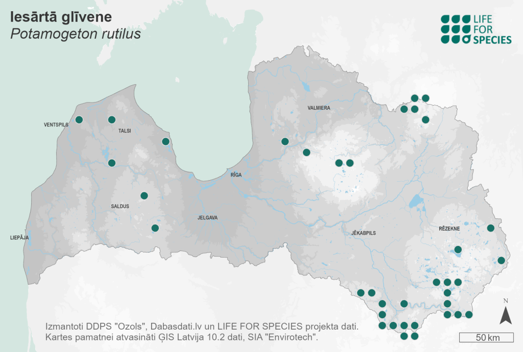 Summary. Shetland pondweed – Potamogeton rutilus. It is rare throughout Latvia, although it is highly probable that it is more widespread than currently recorded. The AOO is 240 km2, and the EOO – 53,776 km2. Considering the ecological niche of this species, the AOO would not exceed the threshold of the EN category. The species grows in small groups only in clean, slightly or moderately eutrophic lakes with water transparency greater than 2.5 m, very rarely in clean rivers, artificial ponds, and quarry ponds on pure or muddy mineral ground or mud at a depth of 0.1–1.5 m. The threats are lake pollution, drainage in the lake catchment area, intensive recreation, competition from expansive macrophyte species, and deterioration of water quality. The population size in Latvia is unknown. Several P. rutilus localities occur in protected areas; most of them in the “Augšzeme” Protected Landscape Area, while the majority of localities are not under protection. Studies on the distribution of the species are needed; the population size should be estimated. Factors causing lake water quality deterioration must be averted. This should be done by including appropriate measures in site management plans for protected areas. P. rutilus should be included on the list of protected species.