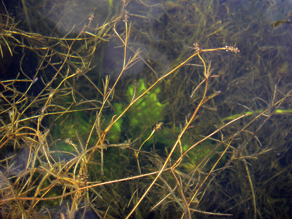 Morfoloģija un bioloģija. Daudzgadīgs 30–50 (100) cm garš ūdensaugs. Augi bez sakneņa vai saknenis tievs, īss. Stublājs tievs, nezarots vai ar nedaudziem sānzariem, šķērsgriezumā viegli saplacināts. Augs tikai ar zemūdens lapām. Lapas nedaudz stīvas, puscaurspīdīgas, spilgti zaļas, galvenokārt lapu apakšpusē bieži ar iesārti brūnu nokrāsu, sēdošas, šauri lineāras, 3–7 cm garas, 0,6–1,5 mm platas, gals pakāpeniski gari nosmailots, mala gluda, pamats šauri ķīlveidīgs. Lapas ar 3 (5) dzīslām, vidējā viegli izcilnēta. Pie lapas pamata bez dziedzerkārpiņām. Pielapes 1–2,5 cm garas, cietas, pie pamata saaugušas, ar nosmailotiem galiem, sākumā zaļganas, vēlāk gandrīz baltas. Ziedkopas kāts 1,5–2,5 (3) cm garš. Vārpiņā līdz sešiem ziediem. Auglis riekstiņš, 1,5–2,5 mm garš, spīdīgs, gluds, sārti brūns, muguras ķīlis neizteikts, knābītis taisns. Zied jūlijā un augustā (Gavrilova 2011). Paaudzes ilgums ir desmit gadi (Solstad et al. 2021).