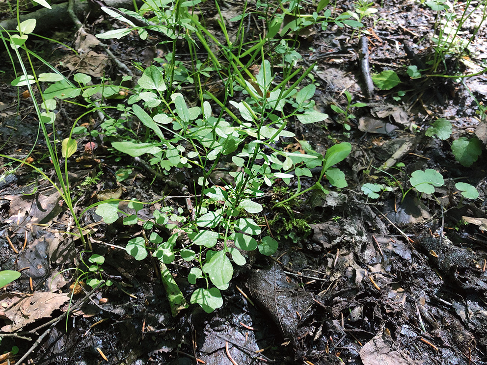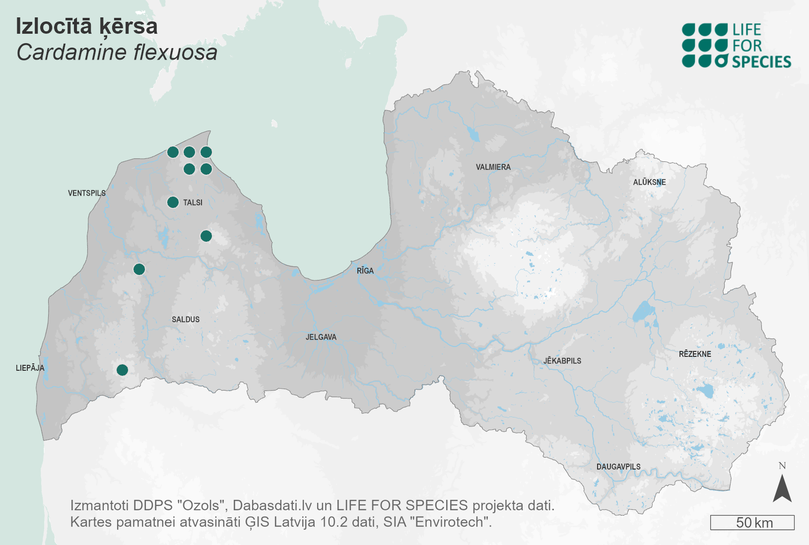 Summary. Wavy bitter-cress – Cardamine flexuosa. In Latvia, it is found only in the western part of the country; in the past, also recorded in south-eastern Latvia near Ilūkste. The EOO is 2,929 km2, and the AOO – 92 km2. The species is probably more frequent than currently known, especially in western Latvia. The size of subpopulations and population dynamics in Latvia are unknown. Surveys in 2022 in north-western Latvia showed that the number of individuals per site varies from a few to several hundred. The species is also known from gardens in Riga and the Botanical Garden of the University of Latvia, but this assessment considers only the localities in the wild. Most likely, it has been introduced into synanthropic habitats in urban areas with alien plant material. C. flexuosa grows in deciduous ravine and slope forests with ash, and in spring-fed habitats along small rivers where the tree composition is formed by black alders and spruces. It grows on bare soil in partially shaded places as single plants or in small groups. The species is mainly threatened by logging, forest drainage and natural succession, which is probably accelerated by prolonged periods of drought during the growing season. There is no data on the percentage of the Latvian population in protected areas since the total distribution and population size are unknown. Significant subpopulations are in the Slītere National Park and the “Kaļķupes ieleja” Nature Reserve. One microreserve has been established for the conservation of C. flexuosa. Research on the distribution of the species and the determination of the population size are necessary. Drainage and logging should not be permitted in the species’ habitats.