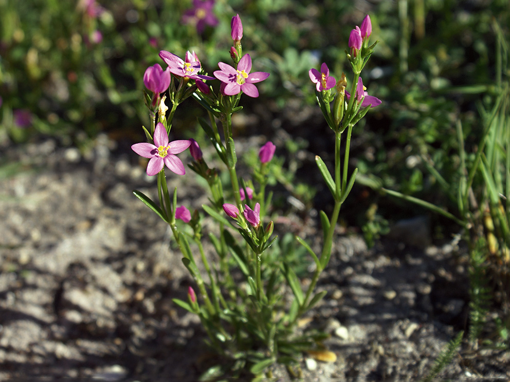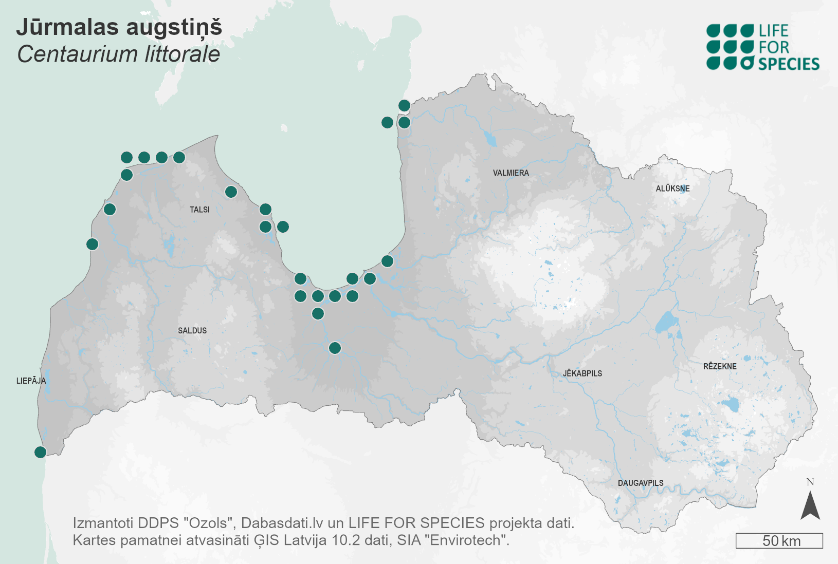 Summary. Seaside centaury – Centaurium littorale. It is rare in Latvia, mainly found in the Coastal Lowland: on the Baltic Sea coast in northern Kurzeme and several places on the Gulf of Riga coast. The EOO is 24,220 km2, and the AOO – 212 km2. Based on a survey at eight sites in 2023, the population size was 2,297 individuals per 3,390 m2, the average population density was 1.65 individuals/m2. The species grows in small groups (20–50 individuals) or only a few individuals (1–8). C. littorale grows in brackish, nutrient-poor soils, typical in interdune depressions, coastal grasslands, alkaline fens, shores of coastal lakes, roadsides, abandoned roads. The species is associated with the initial stages of secondary vegetation succession, when bare soil is exposed after disturbances. The species is light-demanding and cannot compete with tall herbaceous plants. The threats are the degradation and transformation of ecosystems due to improper management of alkaline fens and grasslands or cessation of mowing and grazing of these habitats, tourism and recreation activities, and invasive and expansive plant species. Approximately 50% of the species’ localities occur in protected areas, e.g., the “Randu pļavas” and “Ovīši” Nature Reserves; most of them on the coast of the Gulf of Riga. However, the area and quality of the species’ natural habitats tend to decline, which may lead to a C. littorale population decline. Effective management of protected natural areas is necessary, ensuring the restoration and proper maintenance of coastal grasslands, fens, interdune depressions. Considering the rapid increase in anthropogenic load, it is important to pay attention to integrated planning of coastal protection and use, which would also include C. littorale localities. When developing site management plans for protected areas, a survey of the species’ habitats and an assessment to propose management should be carried out. The population should be monitored to assess the population trends and to ensure its conservation by specific management measures. It is necessary to develop the species' protection plan.