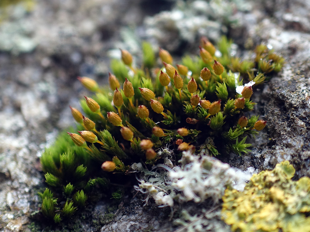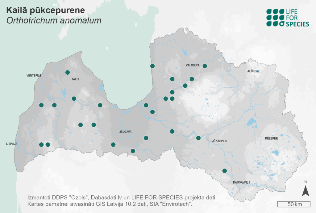 Summary. Anomalous bristle-moss – Orthotrichum anomalum. The moss occurs in the northern hemisphere: Europe from the Scandinavian Peninsula to the Mediterranean, several regions in Asia (Middle East, Siberia, etc.), North America and Central America. It was first found in Latvia by K. R. Kuppfer in 1913. It is found throughout Latvia, but is very rare in the regions of eastern Latvia. 27 localities are known today. EOO is 35,391 km2, and AOO is 104 km2. No regional population studies have been carried out for the species in Latvia. The population is on an upward trend compared to the data from the historical sites. In Latvia, the species grows in urban areas, parks, roadsides on granite boulders, fence posts, slate roofs, old walls, concrete flower bed edges, grave slabs and gravestones, rarely on natural dolomite outcrops. The species is threatened by the degradation of suitable substrate and environment – maintenance of stone surfaces, roofs and removal of moss can be an unwanted disturbance. In Latvia, the regional population of the species is stable, but due to its association with a specific substrate it is assessed as Near Threatened (NT). The species is not included on the list of protected species of Latvia. It does not require legal protection status. Localities are found in protected nature territories – the “Klintaine” and “Raķupes ieleja” Nature Reserves, the Gauja National Park, and the “Embūte” Nature Park. By raising awareness of the relationship of epilithic mosses to man-made substrates, the species would be protected from the degradation that can occur when surfaces are maintained and mosses are removed.